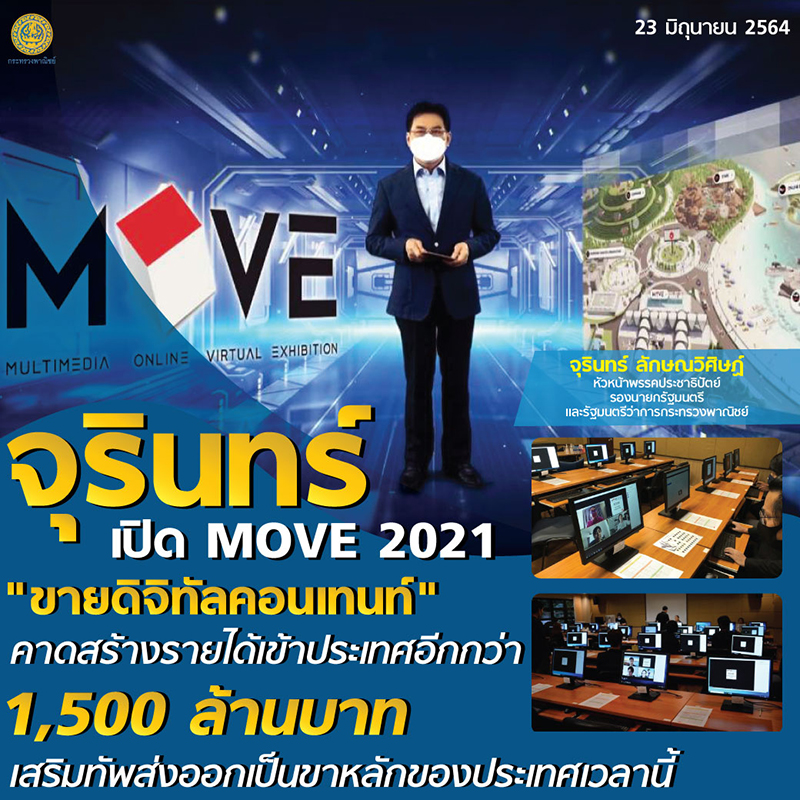 นายจุรินทร์ ลักษณวิศิษฏ์ รองนายกรัฐมนตรีและรัฐมนตรีว่าการกระทรวงพาณิชย์ เปิดโครงการ Multimedia Online Virtual Exhibition หรือ MOVE 2021 ผ่านแพลตฟอร์มออนไลน์ WWW.MOVE-DITP.COM โดยโครงการนี้ได้จัดขึ้นต่อเนื่องเป็นปีที่ 2 เพื่อแสดงศักยภาพอุตสาหกรรมดิจิทัลคอนเทนต์ของไทย คาดว่าจะทำรายได้เข้าประเทศกว่า 1,500 ล้านบาท โดยการปรับเปลี่ยนรูปแบบการค้าจากระบบออฟไลน์เป็นระบบออนไลน์ การพัฒนาศักยภาพและเพิ่มช่องทางการตลาดให้ธุรกิจบริการในรูปแบบใหม่โดยเฉพาะกับธุรกิจดิจิทัลคอนเทนต์ ซึ่งเป็นหนึ่งในภาคธุรกิจที่มีการเปลี่ยนแปลงตลอดเวลา และอุตสาหกรรมดิจิทัลคอนเทนต์ของไทยยังเป็นอุตสาหกรรมที่สร้างชื่อเสียงให้แก่ประเทศ ด้วยการผสมผสานระหว่างความคิดสร้างสรรค์ การทำงานอย่างมีประสิทธิภาพ และนวัตกรรมที่ล้ำสมัย ทำให้กลายเป็นหนึ่งในอุตสาหกรรมที่ขยายตัวเป็นอย่างมากในช่วงทศวรรษที่ผ่านมา