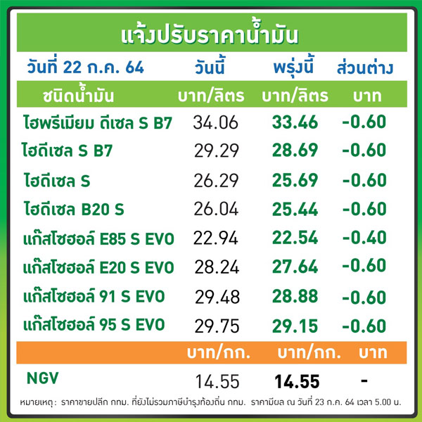 บมจ.ปตท.น้ำมันและการค้าปลีก (OR) และ บมจ.บางจาก คอร์ปอเรชั่น (BCP) ประกาศปรับลดราคาขายปลีกน้ำมันทุกชนิด 60 สต. เว้น E85 ลง 40 สต. มีผลพรุ่งนี้ 23 ก.ค.64 เวลา 05.00 น. เป็นต้นไป