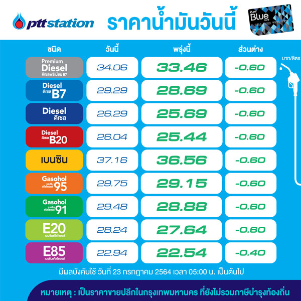 บมจ.ปตท.น้ำมันและการค้าปลีก (OR) และ บมจ.บางจาก คอร์ปอเรชั่น (BCP) ประกาศปรับลดราคาขายปลีกน้ำมันทุกชนิด 60 สต. เว้น E85 ลง 40 สต. มีผลพรุ่งนี้ 23 ก.ค.64 เวลา 05.00 น. เป็นต้นไป