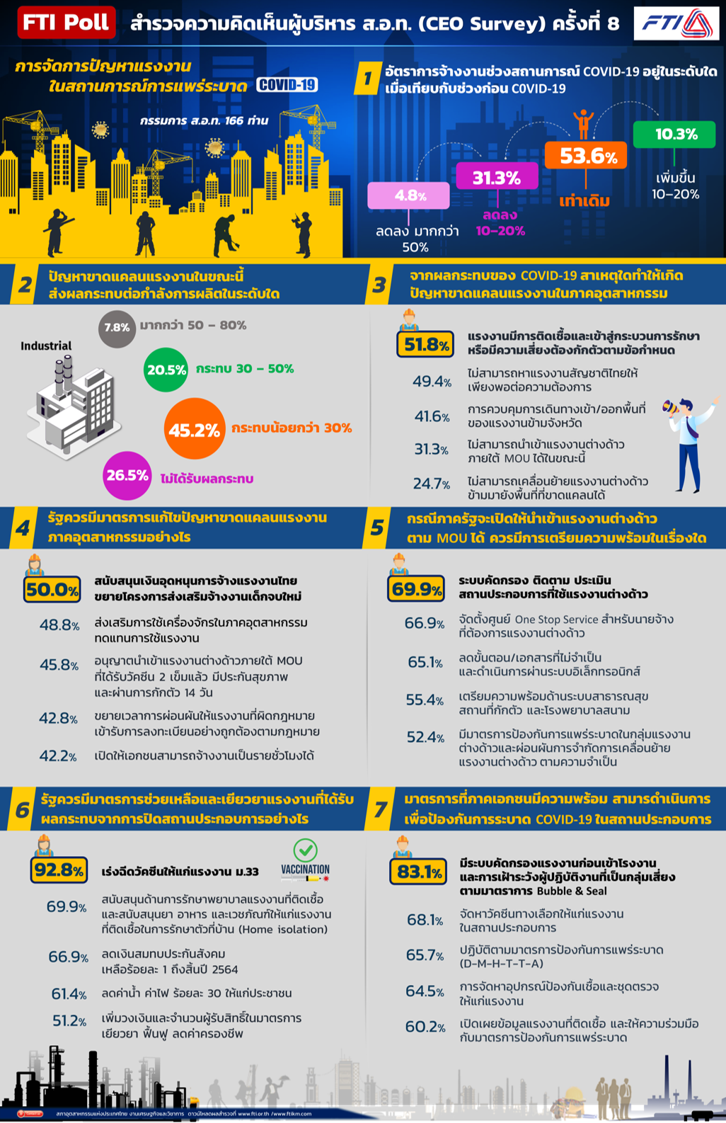นายวิรัตน์ เอื้อนฤมิต รองประธานสภาอุตสาหกรรมแห่งประเทศไทย (ส.อ.ท.) เปิดเผยผลการสำรวจ FTI Poll ครั้งที่ 8 ในเดือนกรกฎาคม 2564 ภายใต้หัวข้อ “การจัดการปัญหาแรงงานในสถานการณ์การแพร่ระบาดโควิด-19” พบว่า ผู้บริหาร ส.อ.ท. ส่วนใหญ่ มองว่า สถานการณ์การแพร่ระบาดของโควิด-19 ในขณะนี้ ส่งผลกระทบต่อแรงงานในภาคอุตสาหกรรมทั้งปัญหาการแพร่ระบาดของโควิด-19 ในโรงงานอุตสาหกรรม รวมทั้ง ปัญหาขาดแคลนแรงงานในอุตสาหกรรมที่มีการใช้แรงงานเข้มข้น จนส่งผลทำให้กำลังการผลิตลดลงและกระทบต่อการส่งออกของไทย ซึ่งถือเป็นเครื่องยนต์หลักที่ช่วยขับเคลื่อนเศรษฐกิจในช่วงสถานการณ์การแพร่ระบาดโควิด-19 นี้ จึงเสนอให้ภาครัฐเร่งฉีดวัคซีนให้แก่แรงงาน ม.33 เพื่อลดความเสี่ยงการแพร่ระบาดโควิด-19 ในสถานประกอบการ รวมทั้ง รักษาศักยภาพในการผลิตและการส่งออกของประเทศ โดยสาเหตุที่ทำให้เกิดปัญหาขาดแคลนแรงงานในภาคอุตสาหกรรม พบว่า 3 อันดับแรก ได้แก่ แรงงานบางส่วนต้องเข้าสู่กระบวนการรักษาโรค หรือกักตัว รวมทั้ง การปิดโรงงานชั่วคราวตามข้อกำหนด สถานประกอบการไม่สามารถหาแรงงานสัญชาติไทยได้เพียงพอต่อความต้องการ และมาตรการควบคุมการเดินทางเข้าออกพื้นที่ของแรงงานข้ามจังหวัด