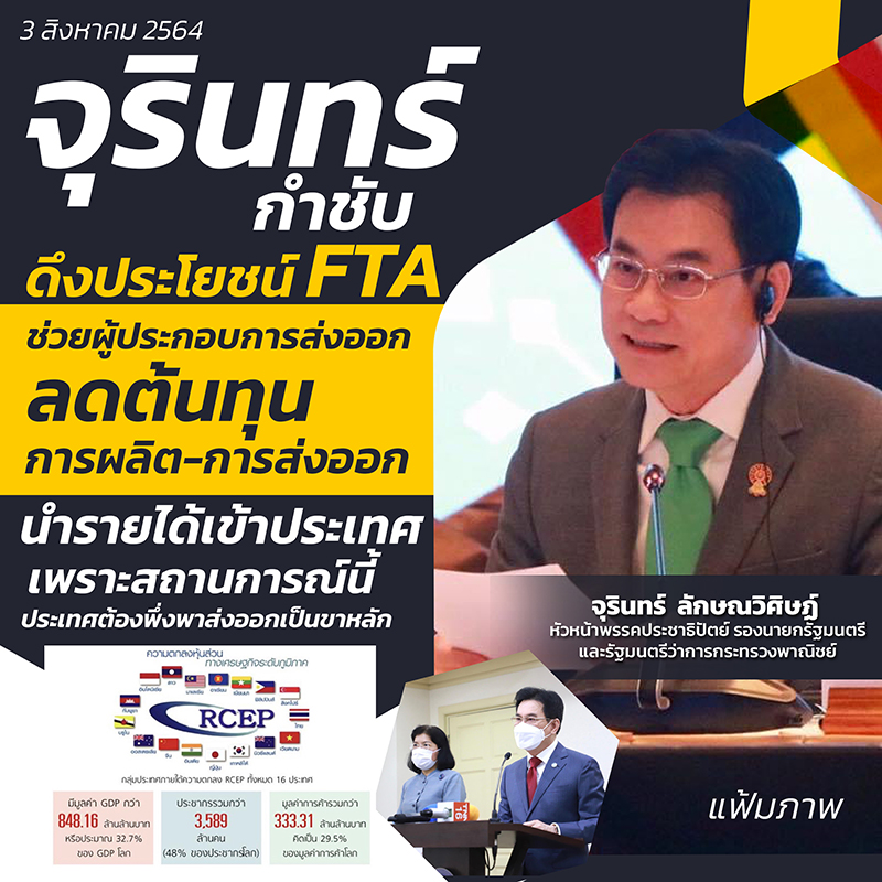 ซึ่งปัจจุบันไทยมี FTA กับ 18 ประเทศ โดยในปี 2563 มีการค้ารวมกันกว่า 276,000 ล้านเหรียญสหรัฐฯ คิดเป็นร้อยละ 63 ของการค้าไทยกับทั้งโลก สำหรับในช่วง 6 เดือนแรกของปี 2564 การค้าของไทยกับประเทศคู่ FTA มีมูลค่ารวม กว่า 167,370 ล้านเหรียญสหรัฐฯ ขยายตัวร้อยละ 23 เมื่อเทียบกับช่วงเดียวกันของปีก่อน โดยรองนายกรัฐมนตรีและรัฐมนตรีว่าการกระทรวงพาณิชย์ ได้กำชับให้กระทรวงพาณิชย์ โดยกรมเจรจาการค้าระหว่างประเทศ ให้ข้อมูลผู้ประกอบการทุกระยะเพื่อได้ใช้ประโยชน์ทางการค้าและเพิ่มตลาดส่งออกที่สำคัญ
