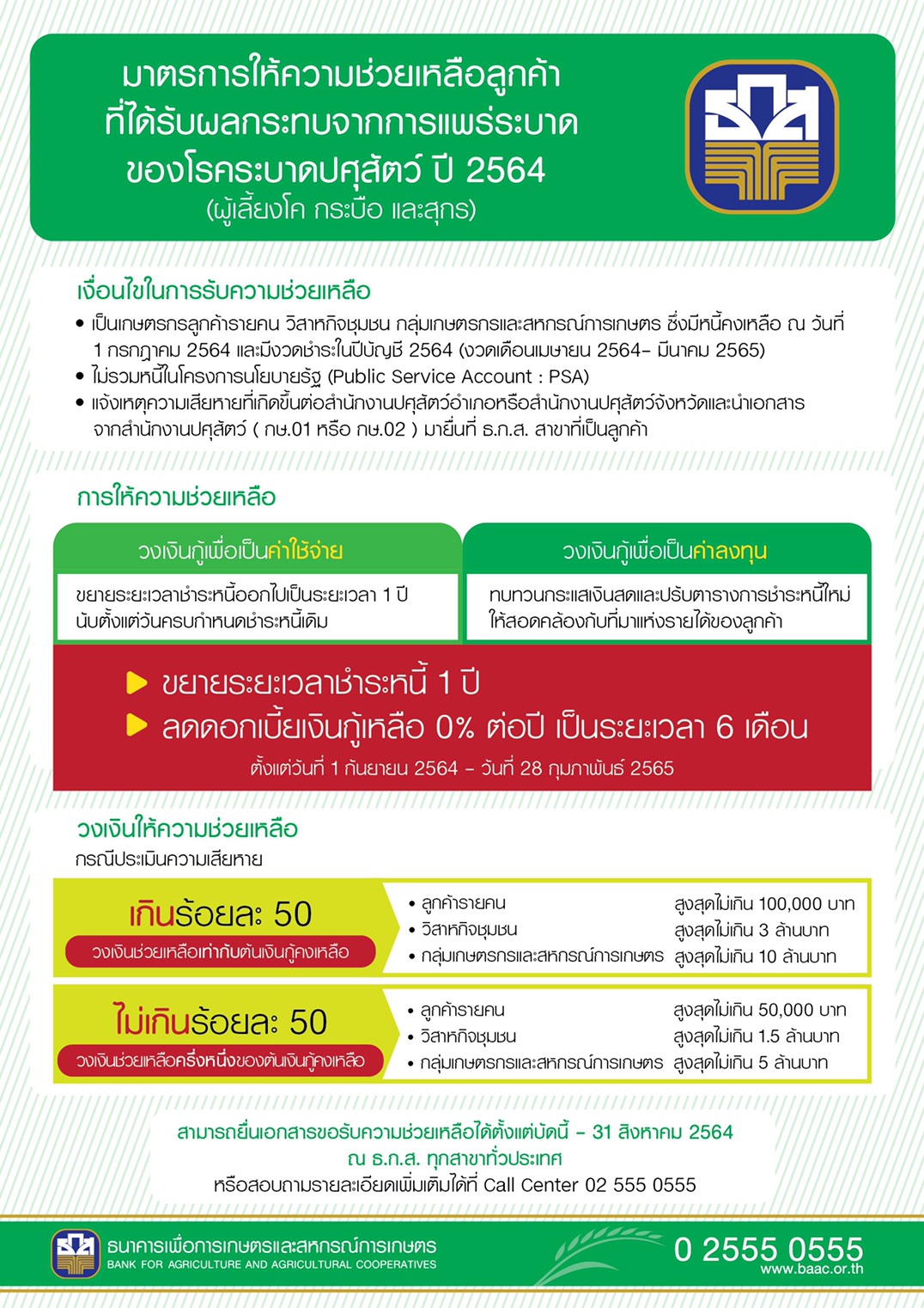 นายสมเกียรติ กิมาวหา รองผู้จัดการ ธ.ก.ส. เปิดเผยว่า จากสถานการณ์โรคระบาดปศุสัตว์ โดยเฉพาะโรคลัมปี สกิน ที่แพร่ระบาดในโค กระบือ และโรคระบาดอื่น ๆ ที่ระบาดในสุกร ซึ่งกระจายในทุกภูมิภาคของประเทศกว่า 62 จังหวัด ส่งผลกระทบต่อการประกอบอาชีพของเกษตรกรและผู้ประกอบธุรกิจด้านปศุสัตว์ อีกทั้งเกษตรกรมีรายได้ลดลงจนไม่สามารถส่งชำระหนี้ได้ตามกำหนด ดังนั้นเพื่อบรรเทาความเดือดร้อน และเป็นการช่วยเหลือให้เกษตรกรลูกค้าสามารถดำเนินธุรกิจต่อไปได้ ธ.ก.ส. จึงได้ดำเนินมาตรการให้ความช่วยเหลือลูกค้าที่ได้รับผลกระทบจากการแพร่ระบาดของโรคระบาดปศุสัตว์ ปี 2564 (ผู้เลี้ยงโค กระบือ และสุกร) ทั้งในส่วนของเกษตรกรลูกค้ารายคน วิสาหกิจชุมชน กลุ่มเกษตรกรและสหกรณ์การเกษตร ซึ่งมีหนี้คงเหลือ ณ วันที่ 1 กรกฎาคม 2564 และมีงวดชำระในปีบัญชี 2564 (งวดเดือนเมษายน 2564 – มีนาคม 2565) ไม่รวมหนี้ในโครงการนโยบายรัฐ โดยแจ้งเหตุความเสียหายจากสถานการณ์ดังกล่าวต่อสำนักงานปศุสัตว์อำเภอหรือสำนักงานปศุสัตว์จังหวัดและนำเอกสารจากสำนักงานปศุสัตว์ (กษ.01 หรือ กษ.02) มายื่นที่ ธ.ก.ส. สาขาที่ท่านเป็นลูกค้า