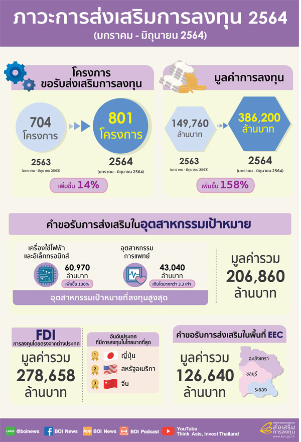 บีโอไอ เผย ยอดขอรับส่งเสริมการลงทุนช่วงครึ่งปีแรก 2564 มูลค่ากว่า 3.8 แสนล้านบาท เติบโตร้อยละ 158 ขณะ อีอีซี 232 โครงการ 126,640 ล้านบาท