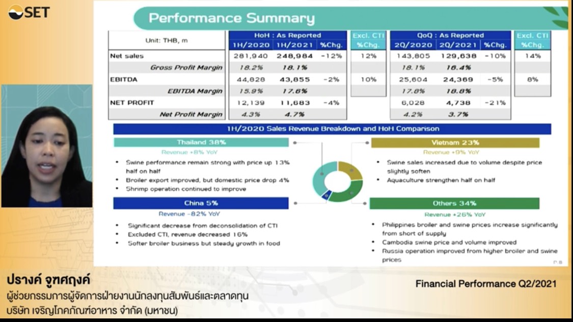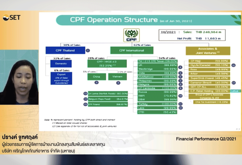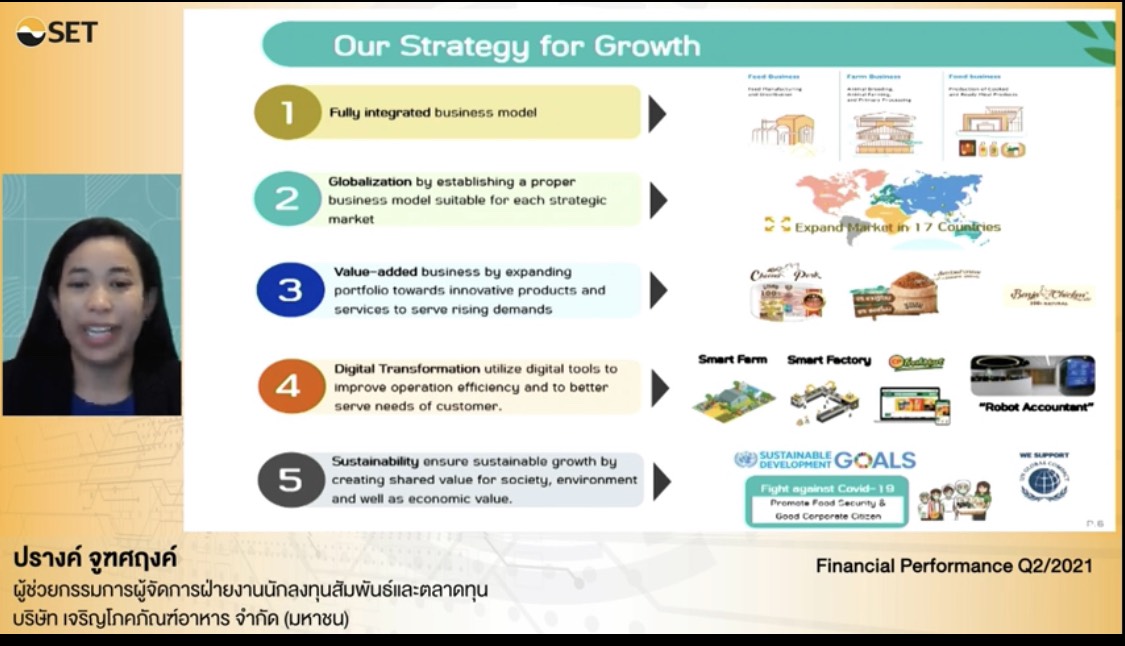 นางกอบบุญ ศรีชัย เลขานุการ และหัวหน้าฝ่ายงานนักลงทุนสัมพันธ์และตลาดทุน บริษัท เจริญโภคภัณฑ์อาหาร จำกัด (มหาชน) หรือ CPF เปิดเผยในงาน “Opportunity Day” ว่า ในช่วงครึ่งปีหลัง บริษัทยังได้รับผลกระทบจากการแพร่ระบาดโควิด-19 สายพันธุ์เดลตา ทำให้บริษัทต้องมีการควบคุมความปลอดภัยในโรงงานให้มากที่สุด เพื่อไม่ให้รับผลกระทบสายการผลิต ไม่หยุดชะงักกระทบต่อรายได้
