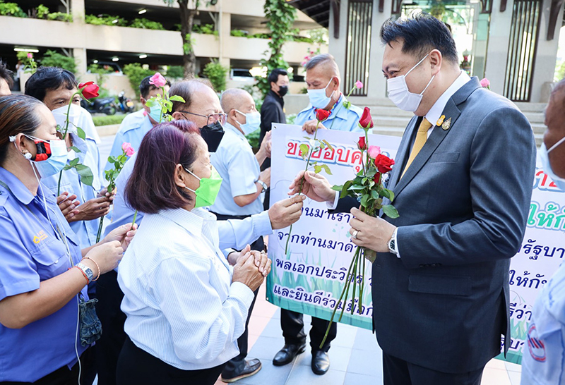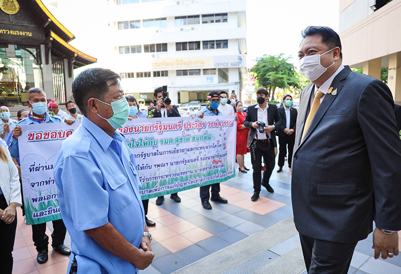 นายวิฑูรย์ แนวพานิช นายกสมาคมการค้าแท็กซี่ไทย นางฐนิวรรณ กุลมงคล นายกสมาคมภัตตาคาร และ นางญาดา พรเพชรรัมภา นายกชมรมหาบเร่แผงลอยกรุงเทพมหานคร เข้าพบ นายสุชาติ ชมกลิ่น รัฐมนตรีว่าการกระทรวงแรงงาน เพื่อมอบของที่ระลึกและกล่าวขอบคุณ พล.อ.ประยุทธ์ จันทร์โอชา นายกรัฐมนตรี พล.อ.ประวิตร วงษ์สุวรรณ รองนายกรัฐมนตรี ผ่านทาง นายสุชาติ ชมกลิ่น รมว.แรงงาน ในโอกาสที่ได้ให้ความช่วยเหลือเยียวยาแรงงานทั้ง 3 กลุ่ม ที่ได้รับผลกระทบจากโควิด-19 ณ บริเวณด้านล่างอาคารกระทรวงแรงงาน