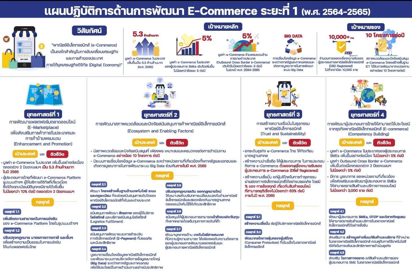 โดยการจัดทำแผนฉบับนี้ จะช่วยสนับสนุน 5 แนวทางฟื้นฟูเศรษฐกิจจากวิกฤตโควิด-19 สร้างบรรยากาศทางธุรกิจ โดยกระทรวงพาณิชย์ได้การดำเนินการขับเคลื่อนและพิจารณากลั่นกรองร่วมกับ 20 หน่วยงาน 8 กระทรวง รวมทั้งภาคเอกชนที่เกี่ยวข้อง เพื่อให้แผนสามารถผลักดันการค้าออนไลน์ได้อย่างมีประสิทธิภาพ ซึ่งจะเกิดประโยชน์ในทุกระดับและทุกภาคส่วน ตั้งแต่ในระดับประเทศ ซึ่งจะช่วยพัฒนาและส่งเสริมแพลตฟอร์มของไทยให้มีความเข้มแข็ง ลดความได้เปรียบของแพลตฟอร์มจากต่างประเทศ และลดความซ้ำซ้อนในการทำงานของทุกภาคส่วน ซึ่งจะนำไปสู่การมีระบบ Big Data ของประเทศที่มีประสิทธิภาพ