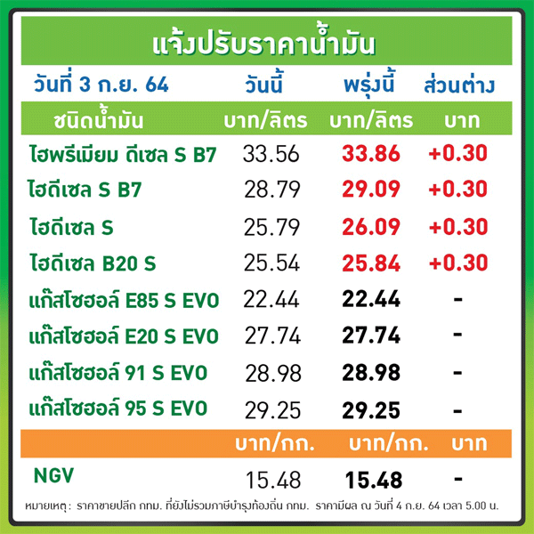 บมจ.ปตท.น้ำมันและการค้าปลีก (OR) และ บมจ.บางจาก คอร์ปอเรชั่น (BCP) ประกาศปรับขึ้นราคาขายปลีกน้ำมันกลุ่มดีเซลทุกชนิด 30 สต. คงกลุ่มเบนซินและแก๊สโซฮอล์ มีผลพรุ่งนี้ 4 ก.ย.64 เวลา 05.00 น. เป็นต้นไป