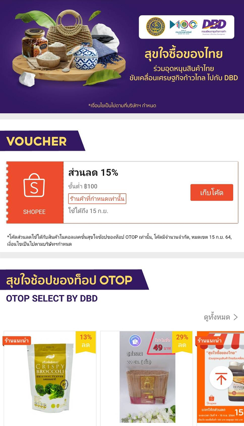 นายทศพล ทังสุบุตร อธิบดีกรมพัฒนาธุรกิจการค้า กระทรวงพาณิชย์ เปิดเผยว่า จากสถานการณ์การแพร่ระบาดของโควิด-19 ส่งผลให้ผู้บริโภคนิยมซื้อสินค้าผ่านช่องทางออนไลน์เพิ่มมากขึ้นแบบก้าวกระโดด ประกอบกับมาตรการป้องกันการแพร่ระบาดของโควิด-19 ทำให้ไม่สามารถจัดกิจกรรมส่งเสริมการตลาดในช่องทางออฟไลน์ได้ กรมฯ จึงปรับเปลี่ยนแนวทางการส่งเสริมการตลาดผลิตภัณฑ์ OTOP เพื่อช่วยเหลือผู้ประกอบการชุมชนให้สามารถเดินหน้าฝ่าวิกฤติโควิด-19 ไปได้ โดยเน้นผลักดันตลาดผลิตภัณฑ์ OTOP เข้าสู่ช่องทางออนไลน์ให้มากขึ้น จึงได้ประสานความร่วมมือกับแพลตฟอร์มออนไลน์ Shopee จัดแคมเปญ “สุขใจช้อปของท็อป OTOP” ระหว่างวันที่ 9-15 กันยายน 2564 พร้อมมอบโค้ดส่วนลดพิเศษร้อยละ 15 สำหรับผลิตภัณฑ์ OTOP Select ที่ผ่านการคัดเลือกจากกรมพัฒนาธุรกิจการค้ากว่า 50 ร้านค้า ขึ้นไปจำหน่ายบนแพลตฟอร์ม Shopee รวมกว่า 2,000 รายการ โดยสามารถเลือกซื้อสินค้าและรับส่วนลดได้ เพียงกรอก Code “OTOPSELECT” ผ่านช่องทาง https://shopee.co.th/dbdonline หรือ ทางแอปพลิเคชัน Shopee