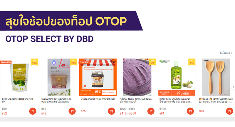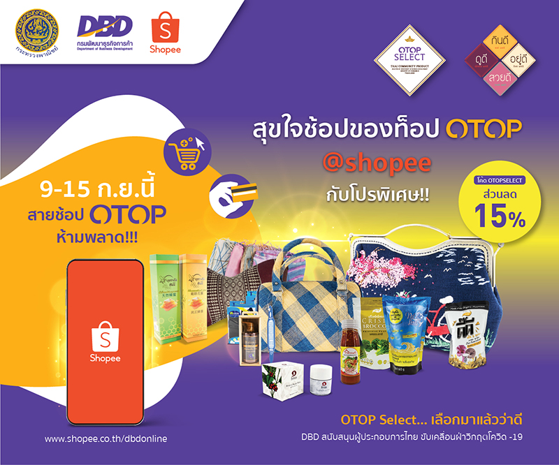 นายทศพล ทังสุบุตร อธิบดีกรมพัฒนาธุรกิจการค้า กระทรวงพาณิชย์ เปิดเผยว่า จากสถานการณ์การแพร่ระบาดของโควิด-19 ส่งผลให้ผู้บริโภคนิยมซื้อสินค้าผ่านช่องทางออนไลน์เพิ่มมากขึ้นแบบก้าวกระโดด ประกอบกับมาตรการป้องกันการแพร่ระบาดของโควิด-19 ทำให้ไม่สามารถจัดกิจกรรมส่งเสริมการตลาดในช่องทางออฟไลน์ได้ กรมฯ จึงปรับเปลี่ยนแนวทางการส่งเสริมการตลาดผลิตภัณฑ์ OTOP เพื่อช่วยเหลือผู้ประกอบการชุมชนให้สามารถเดินหน้าฝ่าวิกฤติโควิด-19 ไปได้ โดยเน้นผลักดันตลาดผลิตภัณฑ์ OTOP เข้าสู่ช่องทางออนไลน์ให้มากขึ้น จึงได้ประสานความร่วมมือกับแพลตฟอร์มออนไลน์ Shopee จัดแคมเปญ “สุขใจช้อปของท็อป OTOP” ระหว่างวันที่ 9-15 กันยายน 2564 พร้อมมอบโค้ดส่วนลดพิเศษร้อยละ 15 สำหรับผลิตภัณฑ์ OTOP Select ที่ผ่านการคัดเลือกจากกรมพัฒนาธุรกิจการค้ากว่า 50 ร้านค้า ขึ้นไปจำหน่ายบนแพลตฟอร์ม Shopee รวมกว่า 2,000 รายการ โดยสามารถเลือกซื้อสินค้าและรับส่วนลดได้ เพียงกรอก Code “OTOPSELECT” ผ่านช่องทาง https://shopee.co.th/dbdonline หรือ ทางแอปพลิเคชัน Shopee