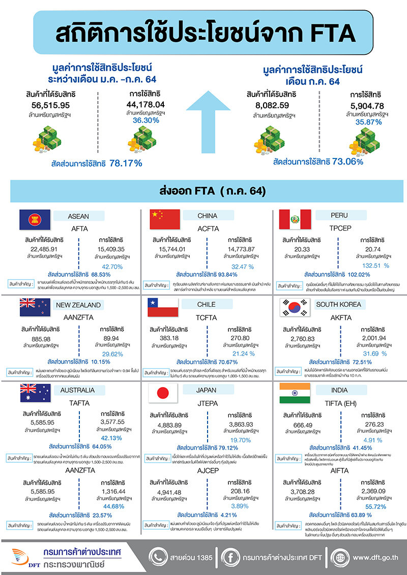 นายกีรติ รัชโน อธิบดีกรมการค้าต่างประเทศ กระทรวงพาณิชย์ เปิดเผยถึงการใช้สิทธิประโยชน์สำหรับการส่งออกภายใต้ความตกลงการค้าเสรี หรือ FTA และภายใต้ระบบสิทธิพิเศษทางภาษีศุลกากรเป็นการทั่วไป หรือ GSP ในช่วง 7 เดือนแรกของปี 2564 พบว่า มีมูลค่าการใช้สิทธิ์กว่า 46,394 ล้านเหรียญสหรัฐฯ เพิ่มขึ้นร้อยละ 36.23 เมื่อเทียบกับช่วงเดียวกันของปีก่อน แบ่งเป็นมูลค่าการใช้สิทธิประโยชน์ภายใต้ความตกลง FTA กว่า 44,178 ล้านเหรียญสหรัฐฯ เพิ่มขึ้นร้อยละ 36.30 โดยตลาดส่งออกที่มีมูลค่าการใช้สิทธิฯ สูงสุด 5 อันดับแรก ได้แก่ อาเซียน จีน ออสเตรเลีย ญี่ปุ่น และ อินเดีย