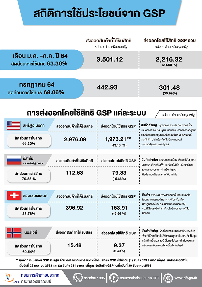 และมูลค่าการใช้สิทธิประโยชน์ภายใต้ระบบ GSP ทั้ง 4 ระบบ ประกอบด้วย สหรัฐอเมริกา สวิตเซอร์แลนด์ รัสเซียและเครือรัฐเอกราช และนอร์เวย์ กว่า 2,216 ล้านเหรียญสหรัฐฯ เพิ่มขึ้นร้อยละ 34.98 โดยตลาด ที่มีมูลค่าการใช้สิทธิฯ มากที่สุดคือ สหรัฐอเมริกา มีมูลค่าการใช้สิทธิฯ กว่า 1,973 ล้านเหรียญสหรัฐฯ เพิ่มขึ้นร้อยละ 43.16 โดยการใช้สิทธิประโยชน์ทางการค้าที่เพิ่มขึ้นอย่างต่อเนื่องในช่วง 7 เดือนแรกของปี สอดคล้องกับทิศทางการส่งออกของไทยที่ขยายตัวเพิ่มขึ้น