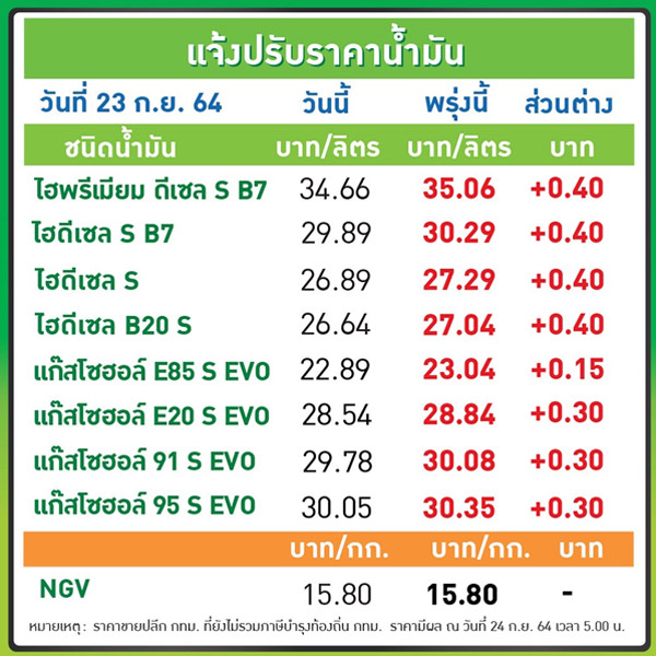 บมจ.ปตท.น้ำมันและการค้าปลีก (OR) และ บมจ.บางจาก คอร์ปอเรชั่น (BCP) ประกาศปรับขึ้นราคาขายปลีกน้ำมันกลุ่มเบนซิน และแก๊สโซฮอล์ทุกชนิด 30 สต. E85 15 สต. และกลุ่มดีเซลทุกชนิด 40 สต. มีผลพรุ่งนี้ 24 ก.ย.64 ตั้งแต่เวลา 05.00 น.เป็นต้นไป