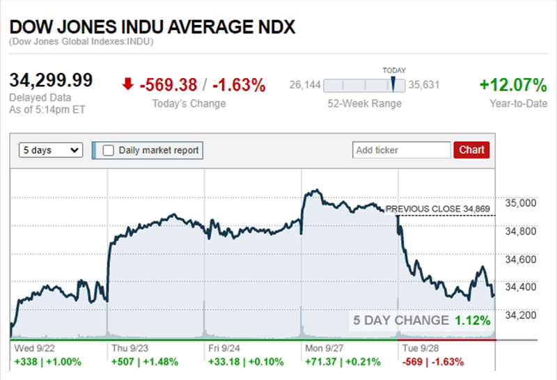 ดาวโจนส์ปิดที่ 34,299.99 จุด ลดลง 569.38 จุด หรือ -1.63%