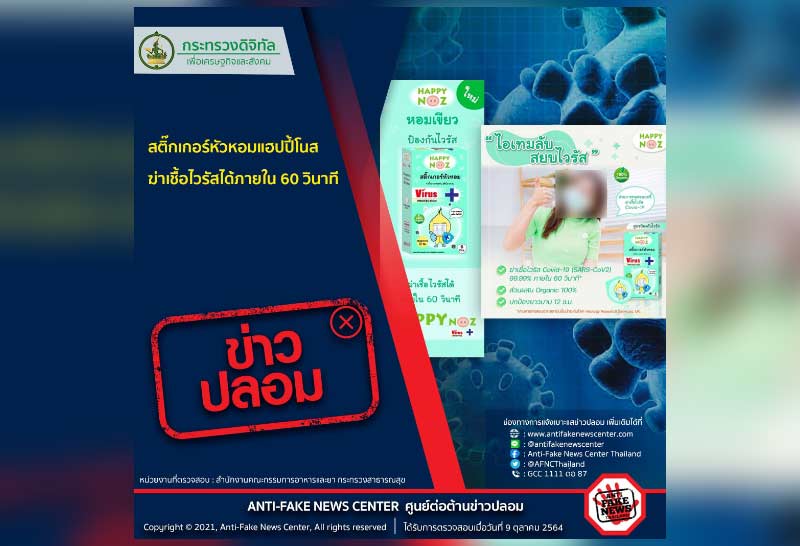 นางสาวนพวรรณ หัวใจมั่น โฆษกกระทรวงดิจิทัลเพื่อเศรษฐกิจและสังคมฝ่ายการเมือง กล่าวว่า ตามที่มีการเผยแพร่ข้อมูลผ่านสื่อโซเชียลมีเดียเรื่อง สติกเกอร์หัวหอมแฮปปี้โนส ฆ่าเชื้อไวรัสได้ภายใน 60 วินาที ทางศูนย์ต่อต้านข่าวปลอมได้ดำเนินการตรวจสอบข้อเท็จจริงโดย สำนักงานคณะกรรมการอาหารและยา กระทรวงสาธารณสุข พบว่าประเด็นดังกล่าวนั้น เป็นข้อมูลเท็จ กรณีผลิตภัณฑ์สติกเกอร์หัวหอม ตราแฮปปี้โนส สูตร Virus Protection ที่ใช้ข้อความแสดงสรรพคุณว่าสามารถฆ่าเชื้อไวรัสได้ภายใน 60 วินาทีนั้น ทางสำนักงานคณะกรรมการอาหารและยา (อย.) ได้ตรวจสอบข้อมูล และเนื้อหาการโฆษณาดังกล่าวพบว่า เป็นผลิตภัณฑ์สมุนไพรที่อยู่ในรูปแบบแผ่นแปะ มีสูตรส่วนประกอบหลักจากหัวหอม กล่าวอ้างสรรพคุณ และวิธีการใช้คือใช้แปะเพื่อฆ่าเชื้อไวรัสและแบคทีเรีย