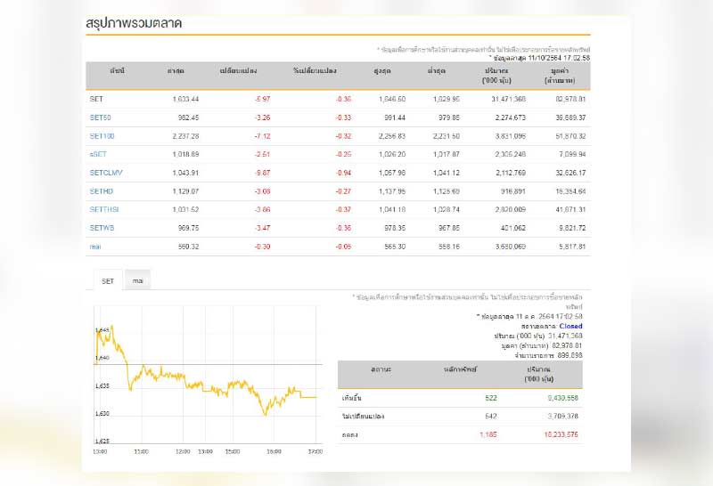 ตลาดหุ้นปิดลบ 5.97 จุด แตะ 1,633.44 จุด มูลค่าการซื้อขาย 82,978.81 ล้านบาท ลดลง 1,185 หลักทรัพย์