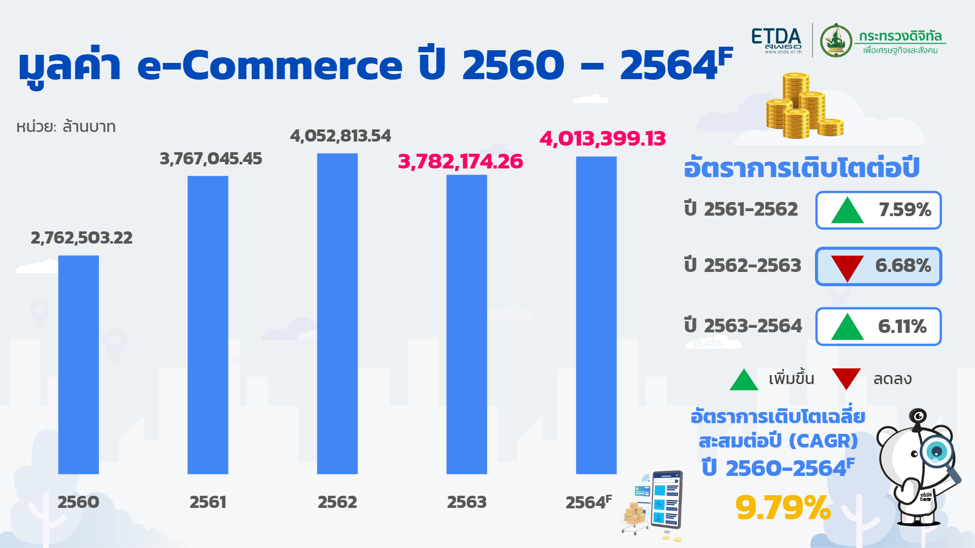 ทั้งนี้ทางสำนักงานพัฒนาธุรกรรมทางอิเล็กทรอนิกส์ หรือ ETDA กระทรวงดิจิทัลเพื่อเศรษฐกิจและสังคม ได้เผยผลสำรวจมูลค่าพาณิชย์อิเล็กทรอนิกส์ในประเทศไทย ปี 2564 หรือ Value of e-Commerce Survey in Thailand 2021 พบว่า ในปี 2563 ธุรกิจพาณิชย์อิเล็กทรอนิกส์หรืออีคอมเมิร์ซในประเทศไทยมีมูลค่าเท่ากับ 3.78 ล้านล้านบาท โดยคาดการณ์ว่ามูลค่าอีคอมเมิร์ซในประเทศไทยในปี 2564 เติบโตอยู่ที่ 4.01 ล้านล้านบาท โดยมีแนวโน้มการเติบโตอย่างต่อเนื่องภายหลังจากการฟื้นตัวจากสถานการณ์โรคระบาดโควิด-19 เป็น 4.01 ล้านล้านบาท หรือเติบโตร้อยละ 6.11 จากปี 256 โดยคาดการณ์อัตราการเติบโตเฉลี่ยสะสมปี 2560 ถึง 2564 อยู่ที่ร้อยละ 9.79