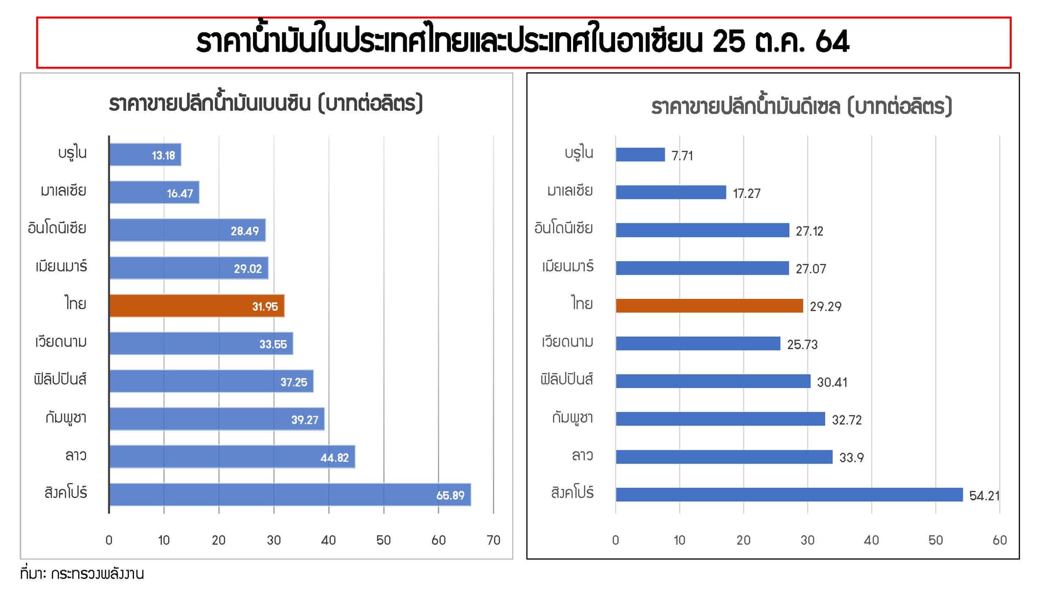 โดยหากวิเคราะห์ในภูมิภาคอาเซียน เกือบทุกประเทศต่างมีการจัดเก็บภาษีสรรพสามิตจากสินค้าพลังงานแล้วทั้งสิ้น ซึ่งส่งผลให้ราคาสินค้าพลังงานของประเทศไทยอยู่ในระดับกลาง ๆ เมื่อเปรียบเทียบกับประเทศในภูมิภาคเดียวกัน โดยหากพิจารณาจากราคาขายปลีกน้ำมันดีเซลในประเทศ ณ วันที่ 25 ตุลาคม 2564 แล้ว อยู่ที่ประมาณ 29 บาทต่อลิตร ในขณะที่สิงคโปร์อยู่ที่ 53 บาทต่อลิตร สปป. ลาวอยู่ที่ 31.50 บาทต่อลิตร กัมพูชาอยู่ที่ 30.24 บาทต่อลิตร ฟิลิปปินส์อยู่ 28.69 บาทต่อลิตร เมียนมาอยู่ 26.95 บาทต่อลิตร และมาเลเซีย (ผู้ส่งออกน้ำมัน) อยู่ที่ 17.42 บาทต่อลิตร
