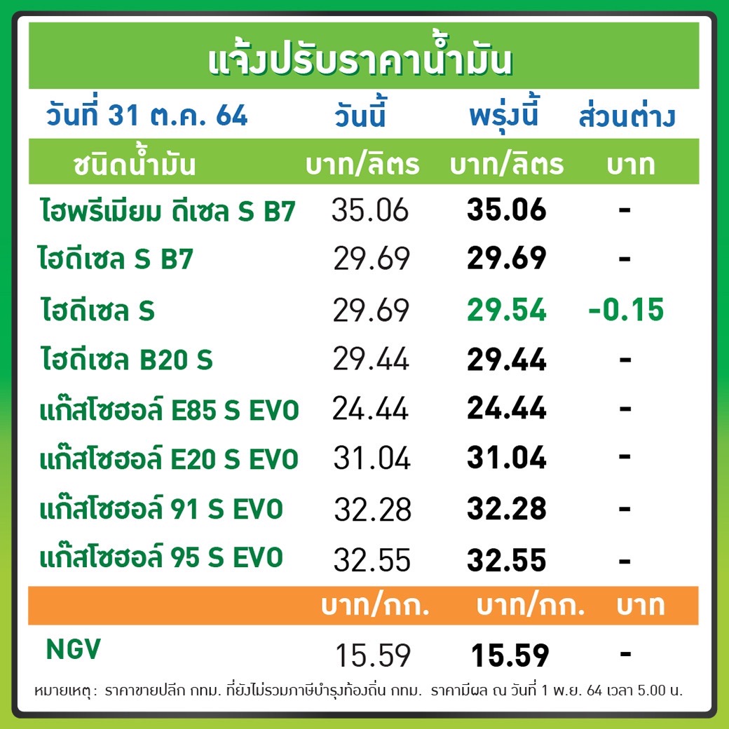 บมจ.ปตท.น้ำมันและการค้าปลีก (OR) และ บมจ.บางจาก คอร์ปอเรชั่น (BCP) ประกาศปรับลดราคาขายปลีกน้ำมันดีเซล B10 ลง 15 สต.ต่อลิตร ส่วนน้ำมันทุกชนิดคงเดิม มีผลพรุ่งนี้ 1 พ.ย.64 เวลา 05.00 น. เป็นต้นไป