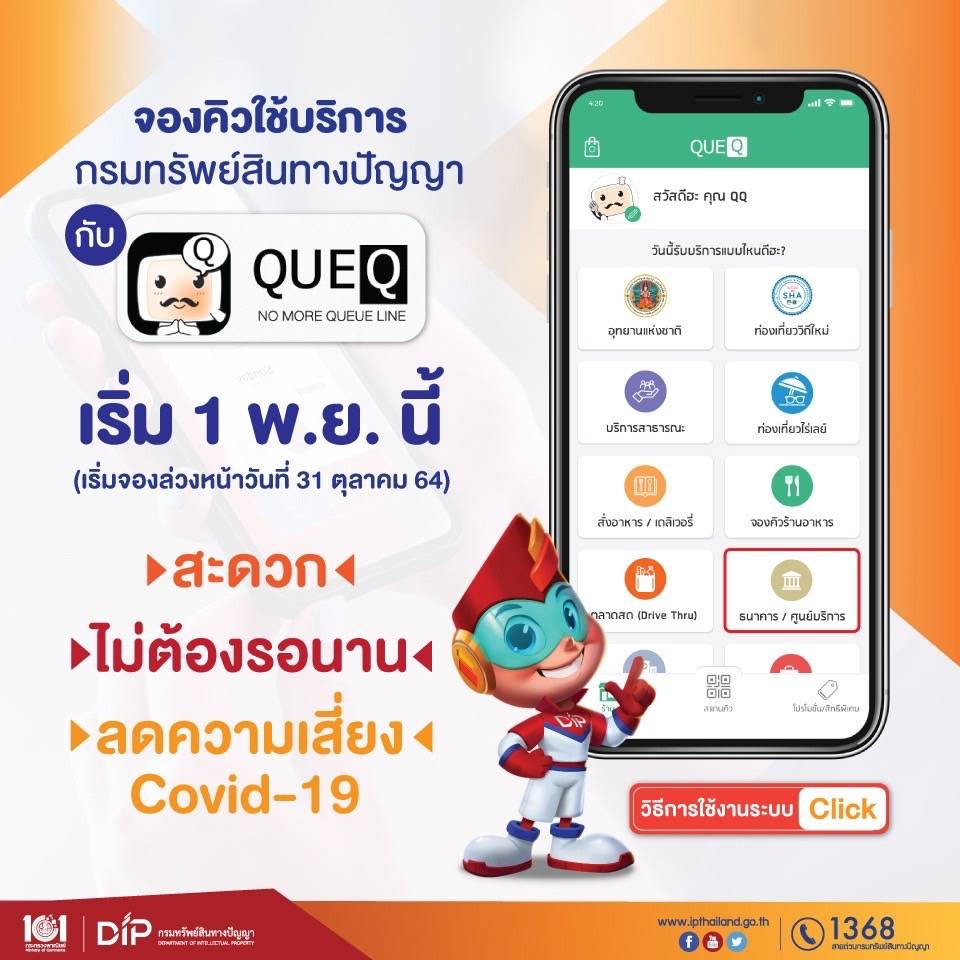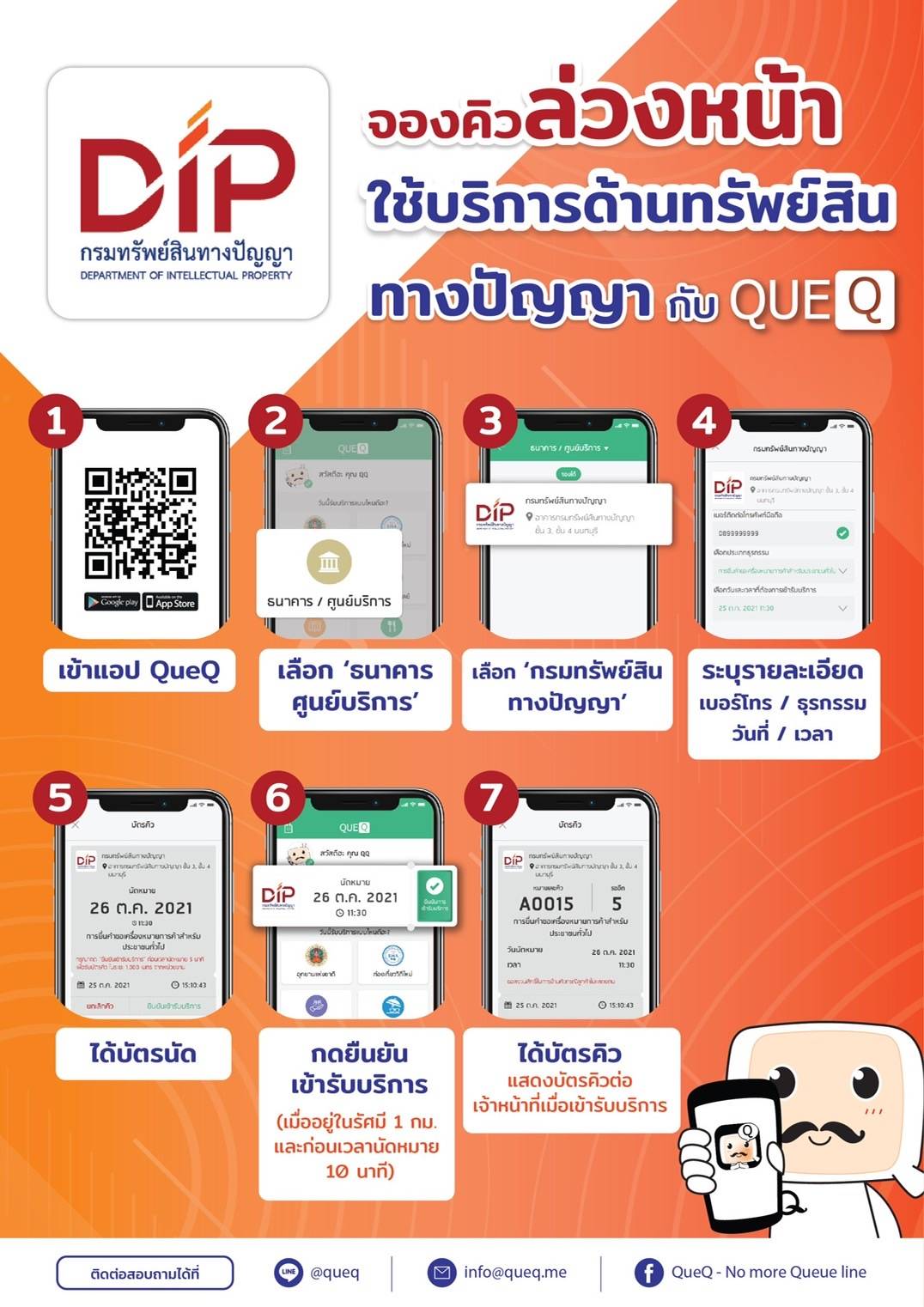 โดยการจองคิวออนไลน์ เพื่อเข้าใช้บริการด้านทรัพย์สินทางปัญญา สามารถทำได้เพียงผู้ติดต่อดาวน์โหลดแอปพลิเคชั่น QueQ ลงในสมาร์ทโฟน เพื่อจองคิวล่วงหน้าอย่างน้อย 1 วัน ก่อนมารับบริการที่ศูนย์บริการประชาชน ชั้น 3 กรมทรัพย์สินทางปัญญา สำหรับผู้ที่มีข้อสงสัยเกี่ยวกับการจองคิวออนไลน์ล่วงหน้าสามารถติดต่อสอบถามข้อมูลเพิ่มเติมได้ที่สายด่วนกรมทรัพย์สินทางปัญญา 1368