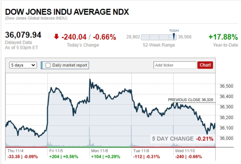 ดาวโจนส์ปิดที่ 36,079.94 จุด ลดลง 240.04 จุด หรือ -0.66%