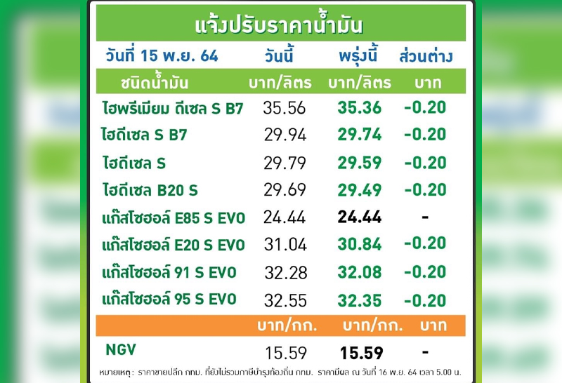 บมจ.ปตท.น้ำมันและการค้าปลีก (OR) และ บมจ.บางจาก คอร์ปอเรชั่น (BCP) ประกาศปรับลดราคาขายปลีกน้ำมันทุกชนิด 20สต./ลิตร เว้น E85 คงเดิม มีผลพรุ่งนี้ 16 พ.ย.64 ตั้งแต่เวลา 05.00 น.เป็นต้นไป