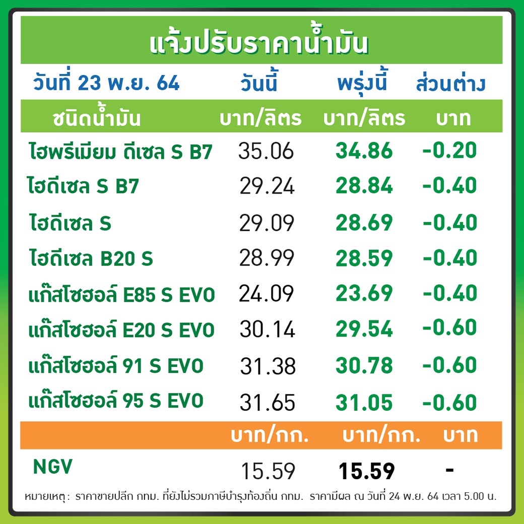 บมจ.ปตท.น้ำมันและการค้าปลีก (OR) และ บมจ.บางจาก คอร์ปอเรชั่น (BCP) ประกาศปรับลดราคาน้ำมันกลุ่มเบนซินและแก๊สโซฮอล์ทุกชนิด 60 สต. เว้น E85 และ กลุ่มดีเซล ลง 40 สต. ขณะที่ดีเซลพรีเมี่ยม B7 ลด 20 สต. มีผลพรุ่งนี้ 24 พ.ย.2564 ตั้งแต่เวลา 05.00 น.เป็นต้นไป