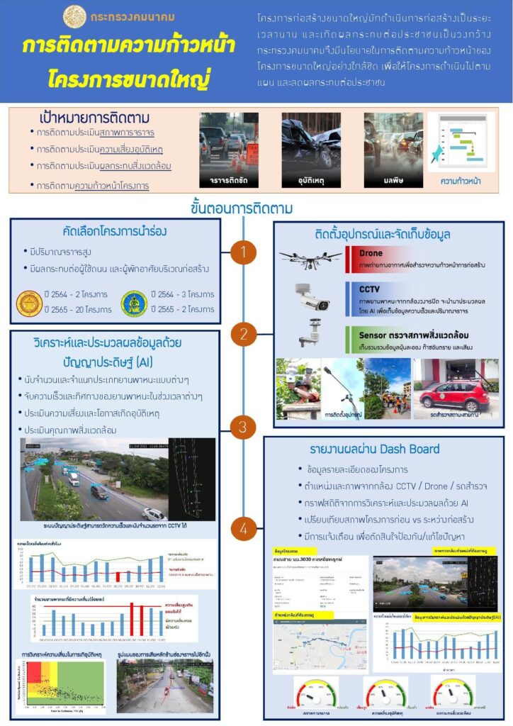 นายอภิรัฐ ไชยวงศ์น้อย อธิบดีกรมทางหลวงชนบท เปิดเผยว่า เนื่องจาก ทช.มีโครงการก่อสร้างขนาดใหญ่หลายโครงการที่ใช้ระยะเวลาในการก่อสร้างและมีแนวโน้มที่อาจส่งผลกระทบต่อการจราจรและพื้นที่โดยรอบกระทรวงคมนาคมจึงได้มีนโยบายให้ ทช.บริหารจัดการจราจรในงานก่อสร้างโดยเฉพาะอย่างยิ่งในช่วงระหว่างดำเนินการก่อสร้าง เพื่อให้การดำเนินงานเป็นไปตามแผนอย่างมีประสิทธิภาพ ลดผลกระทบด้านการจราจร สังคม และสิ่งแวดล้อม ดังนั้น ทช.จึงได้พัฒนาระบบติดตามโครงการขนาดใหญ่โดยมีเป้าหมายในการติดตามประเมินความก้าวหน้าผลการก่อสร้าง สภาพการจราจร ประเมินความเสี่ยงของอุบัติเหตุ และผลกระทบต่อสิ่งแวดล้อม ด้วยการจัดเก็บข้อมูลผ่านเครื่องมืออัตโนมัติที่ติดตั้งในพื้นที่ก่อสร้าง เช่น กล้องวงจรปิด CCTV อุปกรณ์ตรวจวัดสิ่งแวดล้อมและสภาพอากาศ เป็นต้น โดยข้อมูลต่าง ๆ จะถูกส่งไปยังระบบวิเคราะห์และประมวลผลข้อมูลด้วยระบบปัญญาประดิษฐ์ (AI) แบบ Real-Time ซึ่งผู้รับผิดชอบโครงการและเจ้าหน้าที่สามารถติดตามความก้าวหน้าของโครงการ ดำเนินการป้องกันแก้ไขปัญหาที่อาจเกิดขึ้นในบริเวณการก่อสร้างได้อย่างรวดเร็วผ่านทางคอมพิวเตอร์พกพาหรือสมาร์ตโฟน จากการเปรียบเทียบสภาพการจราจรและสภาพอากาศบริเวณโครงการทั้งก่อนดำเนินการ และระหว่างดำเนินการได้อย่างต่อเนื่อง