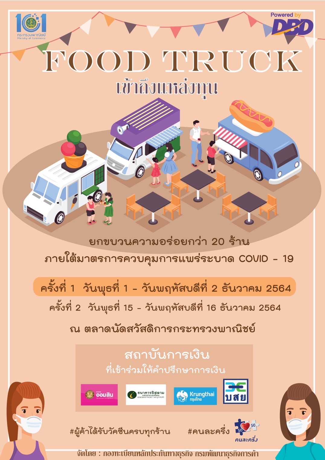 ล่าสุด กรมฯ เตรียมช่วยเหลือกลุ่มผู้ประกอบการธุรกิจร้านอาหารเคลื่อนที่ หรือ ฟู้ดทรัค ที่ได้รับผลกระทบจากการแพร่ระบาดของไวรัสโควิด-19 โดยการเปิดพื้นที่บริเวณลานตลาดนัดกระทรวงพาณิชย์ จังหวัดนนทบุรี ให้ผู้ประกอบการฟู้ดทรัคเข้ามาจำหน่ายสินค้า ระหว่างวันที่ 15-16 ธันวาคม 2564 และได้ประสานสถาบันการเงินร่วมออกบูธภายในงานฯ ให้คำปรึกษาแนะนำแก่ผู้ที่ต้องการลงทุนในธุรกิจ และให้สินเชื่ออัตราดอกเบี้ยพิเศษแก่ผู้ประกอบการฟู้ดทรัคเพื่อให้สามารถเข้าถึงแหล่งเงินทุนได้ง่ายขึ้นด้วยหลักประกันทางธุรกิจ ซึ่งการจัดงานฯ ดังกล่าว มีผู้ประกอบการฟู้ดทรัคเข้าร่วมงานวันละ 20 ราย รวมการจัดงานทั้งสิ้น 2 ช่วง ซึ่งช่วงแรกได้จากไปแล้วในวันที่ 1-2 ธันวาคมที่ผ่านมา