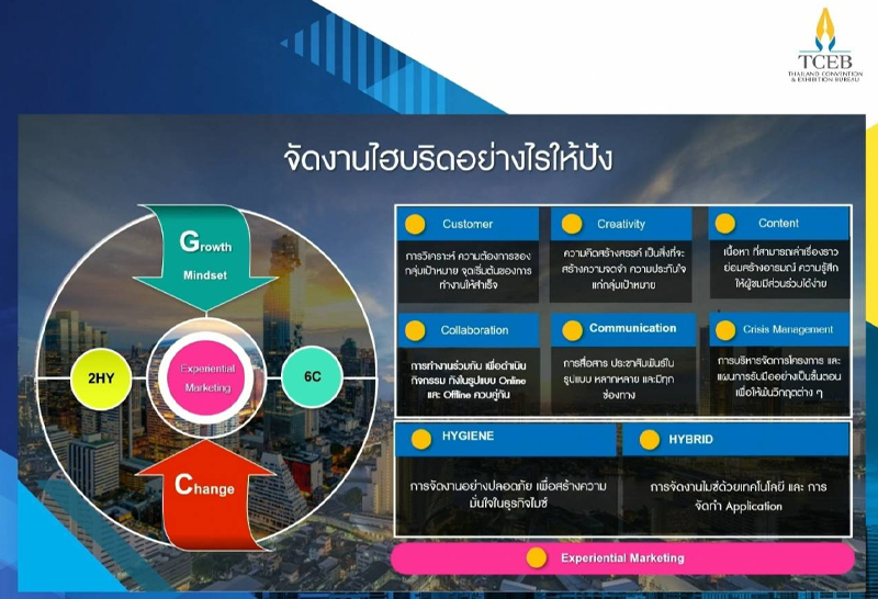 อย่างไรก็ตาม จากประสบการณ์ตรงที่ทางทีเส็บจัดงานในทุกรูปแบบและได้เรียนรู้ “เทคนิคการจัดงานไฮบริด” คือ การนำเทคโนโลยีออนไลน์มาต่อยอดธุรกิจไมซ์ และสิ่งแรกที่ผู้ประกอบการจะต้องปรับเปลี่ยน คือ ทัศนคติที่พร้อมเรียนรู้สิ่งใหม่ (Growth Mindset) ยอมรับการเปลี่ยนแปลง ปรับตัวเพื่อมุ่งไปข้างหน้า ด้วยแนวทาง 2HY ผสานกับ 6C ได้แก่ Customer รู้ความต้องการของผู้เข้าร่วมงาน จึงเป็นจุดเริ่มต้นของความสำเร็จ Creativity ความคิดสร้างสรรค์ เป็นสิ่งที่จะสร้างความจดจำ ประทับใจ ให้กับผู้เข้าร่วมงาน Content เนื้อหาที่ตอบโจทย์ผู้ร่วมงานนำไปใช้และมีส่วนร่วมได้ง่าย Collaboration การดำเนินงานกับพันธมิตร เพื่อให้งานน่าสนใจจากมุมมองที่หลากหลาย Communication การสื่อสารประชาสัมพันธ์ในรูปแบบที่หลากหลายครบทุกช่องทาง และ Crisis Management การบริหารจัดการโครงการ และแผนการรับมืออย่างเป็นขั้นตอนเพื่อให้พ้นวิกฤติต่าง ๆ