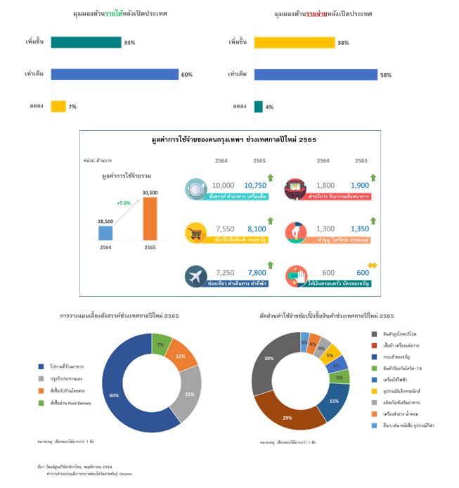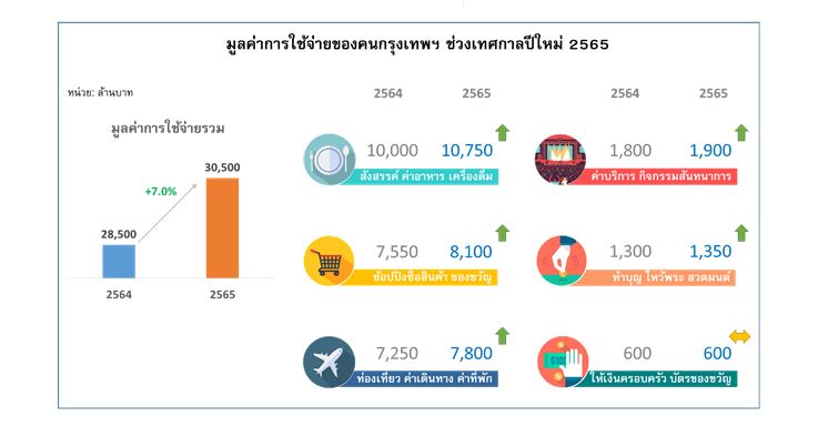 ทั้งนี้คาดว่าการใช้จ่ายของคนกรุงเทพฯ ในช่วงเทศกาลปีใหม่ปีน่าจะอยู่ที่ประมาณ 30,500 ล้านบาท เพิ่มขึ้น 7.0% (YoY) จากฐานที่ต่ำในช่วงปีใหม่ปีที่แล้ว ซึ่งส่วนหนึ่งเป็นผลจากภาวะเงินเฟ้อที่ส่งผลให้ราคาสินค้า