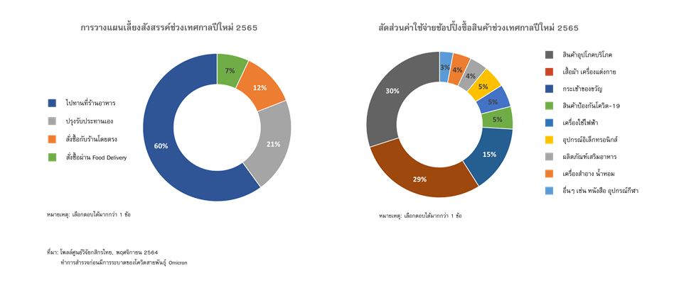 ศูนย์วิจัยกสิกรไทยมองว่าเทศกาลปีใหม่ 2565 น่าจะให้ภาพบรรยากาศที่กลับมาคึกคักมากขึ้นกว่าปีก่อน จากสถานการณ์การระบาดของโควิด-19 และการเข้าถึงวัคซีนที่ดีขึ้น ประกอบกับมาตรการกระตุ้นกำลังซื้อของภาครัฐและการเร่งจัดแคมเปญส่งเสริมการขายของผู้ประกอบการในช่วงเทศกาล อย่างไรก็ตาม ยังคงต้องติดตามการระบาดของโควิด-19 สายพันธุ์ Omicron ที่อาจส่งผลกระทบต่อบรรยากาศการใช้จ่ายช่วงปีใหม่