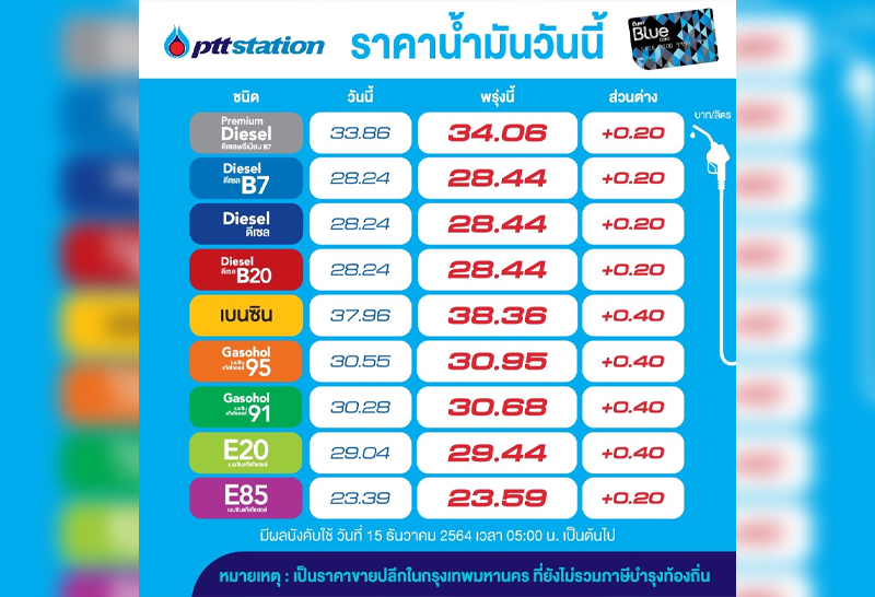 บมจ.ปตท.น้ำมันและการค้าปลีก (OR) และ บมจ.บางจาก คอร์ปอเรชั่น (BCP) ประกาศปรับขึ้นราคาขายปลีกน้ำมันกลุ่มเบนซินและแก๊สโซฮอล์ 40 สต. E85 และ กลุ่มดีเซลขยับ 20 สต. มีผลพรุ่งนี้ 15 ธ.ค.64 ตั้งแต่เวลา 05.00 น.เป็นต้นไป
