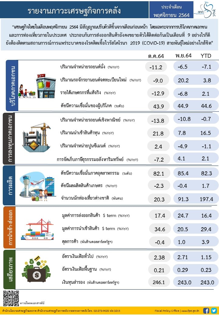 นายวุฒิพงศ์ จิตตั้งสกุล ที่ปรึกษาด้านเศรษฐกิจการคลัง ในฐานะโฆษกสำนักงานเศรษฐกิจการคลัง เปิดเผยว่า เศรษฐกิจไทยในเดือนพฤศจิกายน 2564 มีสัญญาณปรับตัวดีขึ้นจากเดือนก่อนหน้า โดยเฉพาะจากการบริโภคภาคเอกชนและการท่องเที่ยวภายในประเทศ ประกอบกับการส่งออกสินค้ายังคงขยายตัวได้ติดต่อกันเป็นเดือนที่ 9 อย่างไรก็ดี ยังต้องติดตามสถานการณ์การแพร่ระบาดของโรคติดเชื้อไวรัสโคโรนา 2019 (COVID-19) สายพันธุ์ใหม่อย่างใกล้ชิด