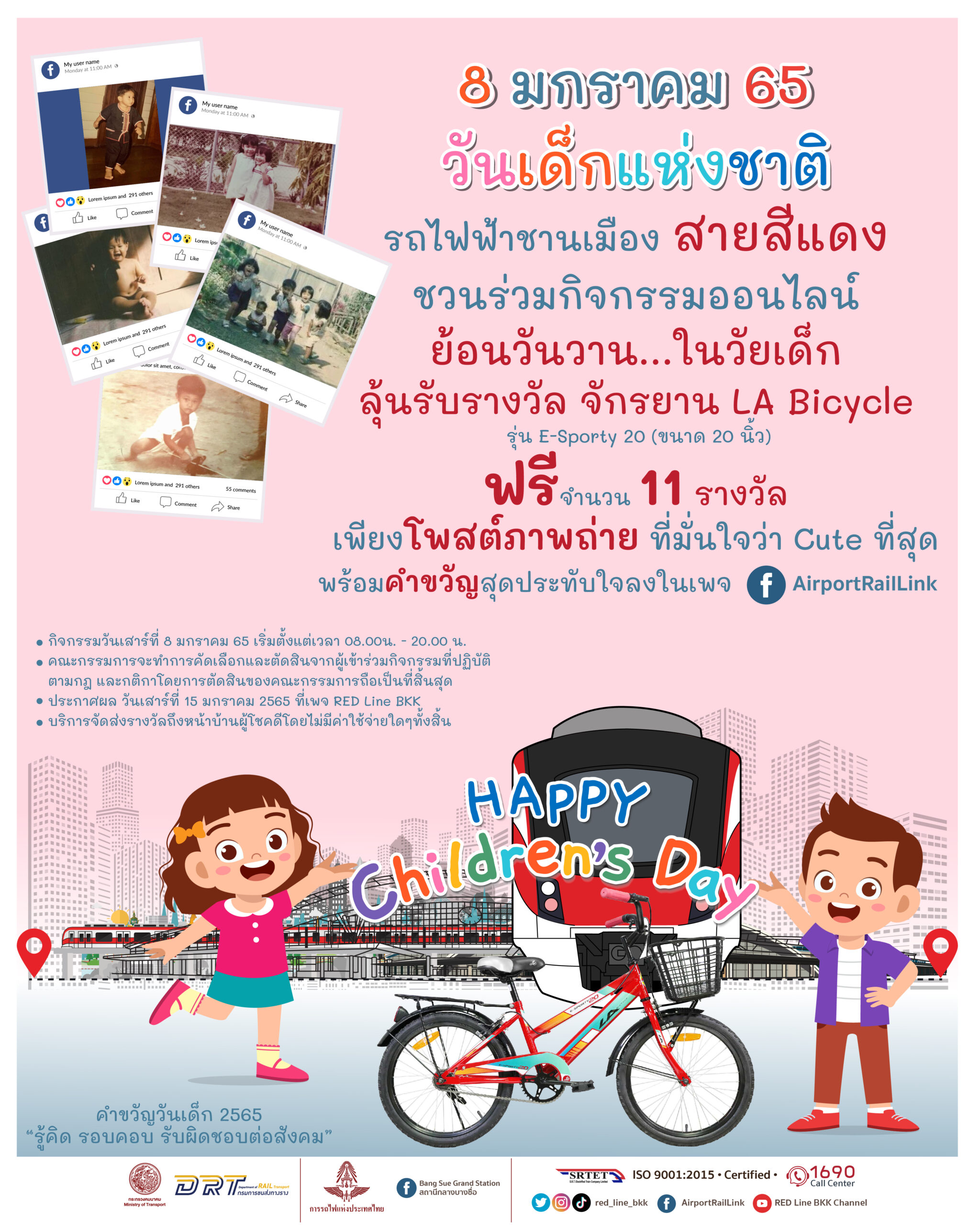 นายสุเทพ พันธุ์เพ็ง กรรมการผู้อำนวยการใหญ่ บริษัท รถไฟฟ้า ร.ฟ.ท. จำกัด ผู้ให้บริการรถไฟฟ้าชานเมืองสายสีแดง เปิดเผยว่า ตามสถานการณ์ปกติเมื่อถึงช่วงวันเด็กแห่งชาติในแต่ละปี บริษัทจะมีการจัดกิจกรรมการตลาดเพื่อส่งมอบความสุข และสร้างรอยยิ้มให้แก่เด็กๆ และผู้โดยสารมาโดยตลอด ทว่าในปีนี้ด้วยสถานการณ์การแพร่ระบาดของไวรัสโควิด-19 ที่กำลังมีแนวโน้มกลับมาเพิ่มสูงขึ้นในปัจจุบัน บริษัทจึงได้ปรับรูปแบบการจัดกิจกรรมการตลาดจากเดิมที่เป็นการจัดกิจกรรมแบบออฟไลน์ เป็นการจัดกิจกรรมส่งเสริมการตลาดในรูปแบบ “ออนไลน์” แทน ด้วยการให้ผู้โดยสารได้ร่วมสนุกโพสต์ภาพวัยเด็กของตัวเอง พร้อมคำขวัญวันเด็กสุดประทับใจ โดยเป็นคำขวัญที่คุณคิดเองหรือจากบุคคลที่มีชื่อเสียงใครก็ได้ ในโพสต์กิจกรรม ซึ่งจะลงในวันที่ 8 มกราคม 2565 ทางเฟซบุ๊ก Airport Rail Link ( เฟซบุ๊กเพจปัจจุบันของรถไฟฟ้าชานเมืองสายสีแดง ) ซึ่งภาพ และคำขวัญที่ได้รับการโหวตจากคณะกรรมการมากที่สุด จะได้รับรางวัลจักรยานแอลเอไบซิเคิล รุ่น อี-สปอร์ตี้ 20 จำนวน 11 รางวัล โดยรางวัลจะจัดส่งถึงบ้าน ฟรี! ไม่เสียค่าใช้จ่าย ทั้งนี้ 1 บัญชีเฟซบุ๊กแอ็กเคานต์สามารถร่วมสนุกได้เพียง 1 สิทธิ์เท่านั้น และการตัดสินของคณะกรรมการถือเป็นที่สิ้นสุด