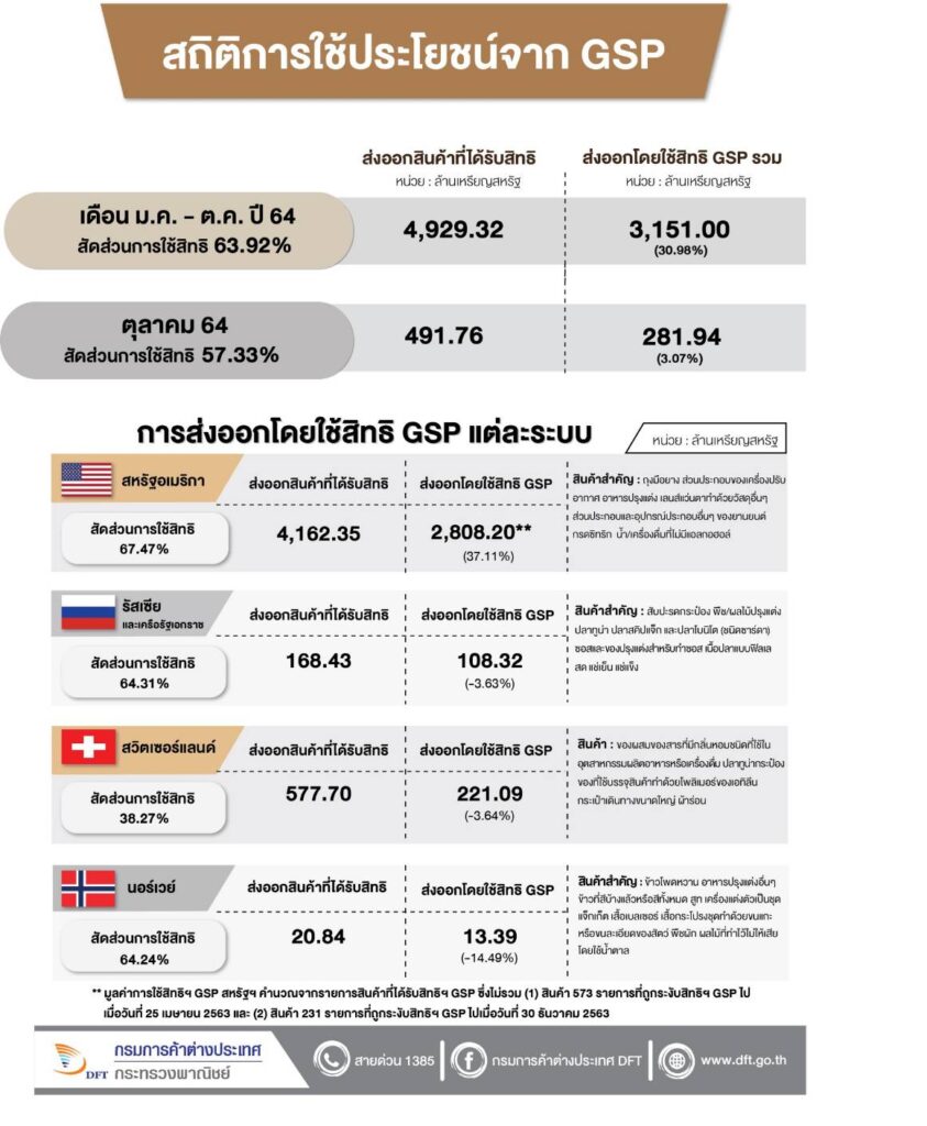 นายพิทักษ์ อุดมวิชัยวัฒน์ อธิบดีกรมการค้าต่างประเทศ กระทรวงพาณิชย์ เปิดเผยถึงสถิติการใช้สิทธิประโยชน์สำหรับการส่งออกภายใต้ภายใต้ระบบสิทธิพิเศษทางภาษีศุลกากรเป็นการทั่วไป หรือ GSP ทั้ง 4 ระบบ (สหรัฐอเมริกา สวิตเซอร์แลนด์ กลุ่มประเทศเครือรัฐเอกราช และนอร์เวย์) ในช่วง 10 เดือนแรกของปี 2564 มีมูลค่า 3,151 ล้านเหรียญสหรัฐฯ เพิ่มขึ้นร้อยละร้อยละ 30.98