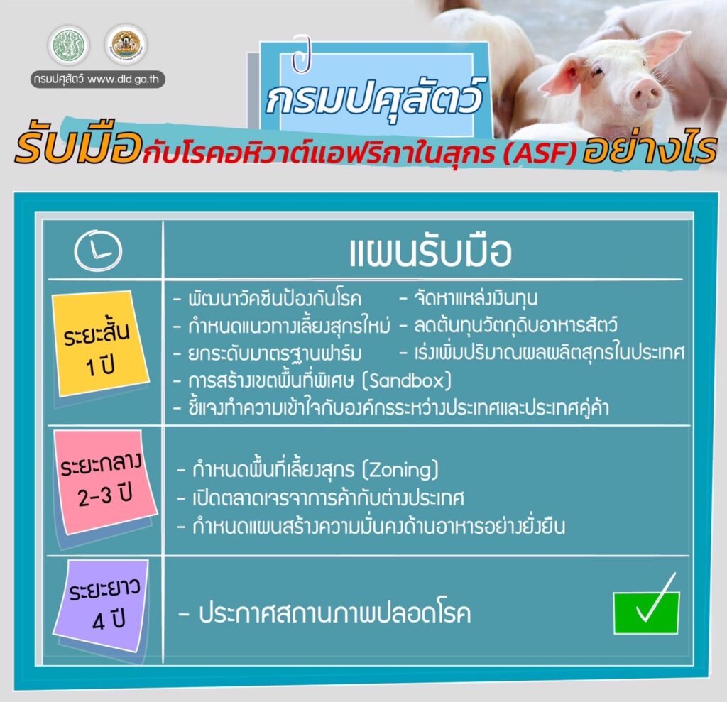 อย่างไรก็ตาม ยืนยันว่า หากตรวจพบการเกิดโรค ASF กระทรวงเกษตรฯ โดยกรมปศุสัตว์ จะเร่งเข้าควบคุมโรคโดยทันที ภายใต้มาตรการต่าง ๆ อย่างรัดกุม และจำกัดวงเพื่อให้เกิดผลกระทบต่อเกษตรกรน้อยที่สุด