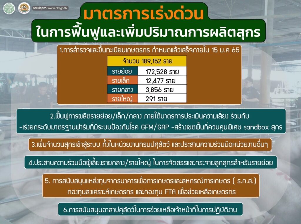 อย่างไรก็ตาม ยืนยันว่า หากตรวจพบการเกิดโรค ASF กระทรวงเกษตรฯ โดยกรมปศุสัตว์ จะเร่งเข้าควบคุมโรคโดยทันที ภายใต้มาตรการต่าง ๆ อย่างรัดกุม และจำกัดวงเพื่อให้เกิดผลกระทบต่อเกษตรกรน้อยที่สุด