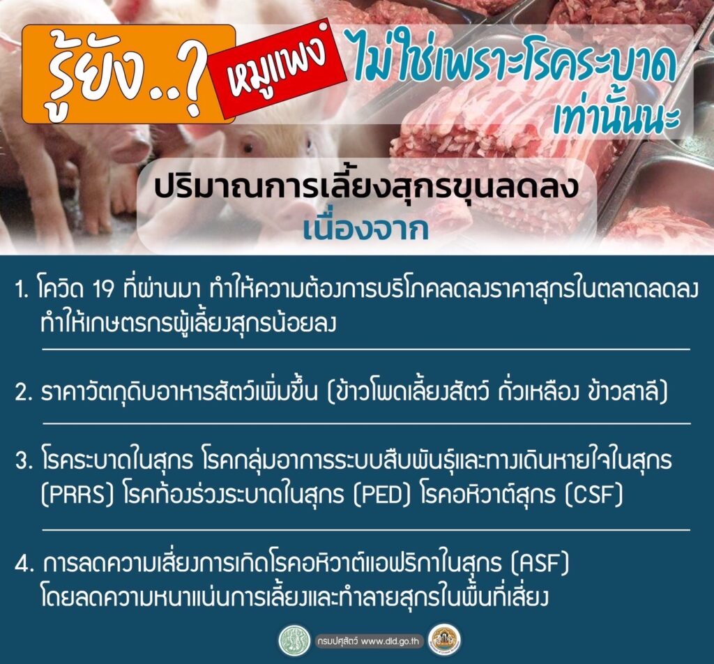 นายประภัตร โพธสุธน รัฐมนตรีช่วยว่าการกระทรวงเกษตรและสหกรณ์ เปิดเผยว่า จากกรณีที่มีกระแสข่าวว่าต้นเหตุที่ราคาเนื้อสุกรมีราคาแพงขึ้นนั้น เกิดจากการระบาดของโรคอหิวาต์แอฟริกาในสุกร (ASF) จึงขอชี้แจงว่า จากการตรวจสอบข้อมูลในปี 2564 มีลูกสุกรเข้าคอกเลี้ยงเฉลี่ยราว 350,000 ตัว ซึ่งปัจจุบันปริมาณลูกสุกรเข้าคอกเลี้ยงก็ยังคงมีตัวเลขใกล้เคียงกัน อีกทั้งยังมีจำนวนสุกรที่เข้าโรงเชือดที่มีปริมาณคงที่มาโดยตลอด จึงเป็นที่น่าสนใจว่าเหตุใดราคาเนื้อสุกรจึงมีราคาแพงขึ้น