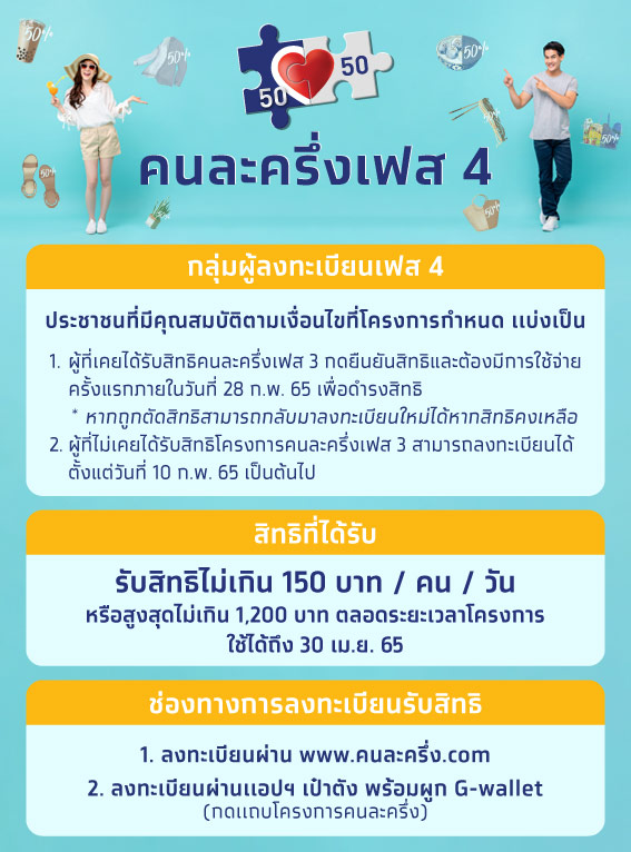 ประชาชนสามารถใช้จ่ายในโครงการต่าง ๆ ได้ตั้งแต่วันนี้จนถึงวันที่ 30 เมษายน 2565 ทั้งนี้ สำหรับประชาชนที่เข้าร่วมโครงการคนละครึ่ง ระยะที่ 3 สามารถกดยืนยันสิทธิเข้าร่วมโครงการคนละครึ่ง ระยะที่ 4 ผ่านแอปพลิเคชัน “เป๋าตัง” อย่างต่อเนื่อง และประชาชนทั่วไปที่ไม่ได้เข้าร่วมโครงการคนละครึ่ง ระยะที่ 3 ขอให้เตรียมรอลงทะเบียนเข้าร่วมโครงการคนละครึ่ง ระยะที่ 4 ผ่านแอปพลิเคชัน“เป๋าตัง” หรือ ผ่านเว็บไซต์ www.คนละครึ่ง.com ได้ตั้งแต่วันที่ 10 กุมภาพันธ์ 2565