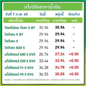 บมจ.ปตท.น้ำมันและการค้าปลีก (OR) และ บมจ.บางจาก คอร์ปอเรชั่น (BCP) ประกาศปรับขึ้นราคา ขายปลีกน้ำมันเบนซินและแก๊สโซฮอล์ทุกชนิด 50 สต. ส่วนกลุ่มดีเซลทุกชนิดคงเดิม มีผลพรุ่งนี้ 8 ก.พ.2565 เวลา 05.00 น. เป็นต้นไปทั้งนี้ ส่งผลให้ราคาน้ำมันขายปลีกในพื้นที่กรุงเทพฯ ที่ยังไม่รวมภาษีบำรุงท้องถิ่นวันพรุ่งนี้ เป็นดังนี้