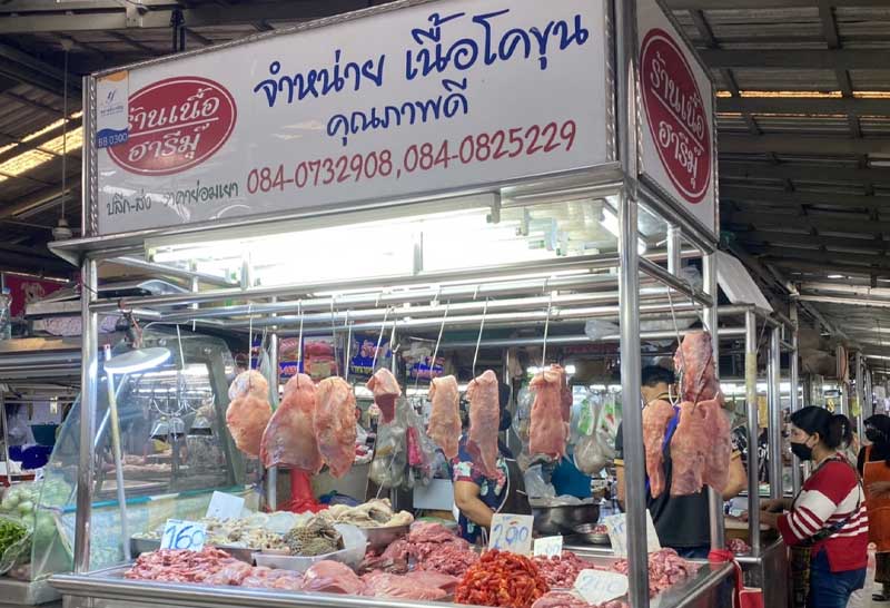 จากการได้ลงพื้นที่สำรวจราคาสินค้าพืชผักที่ตลาดยิ่งเจริญ ย่านสะพานใหม่ พบว่า เนื้อหมูราคา 170-210 บาท ตามชนิดของเนื้อ เช่นหมูเนื้อแดง กิโลกรัมละ 170 บาท สะโพกกิโลกรัมละ 170 บาท สันใน-สันนอกกิโลกรัมละ190บาท สามชั้นกิโลกรัมละ 210 บาท หมูบดกิโลกรัมละ 170 บาท ซี่โครงหมูกิโลกรัมละ 170-200 บาท