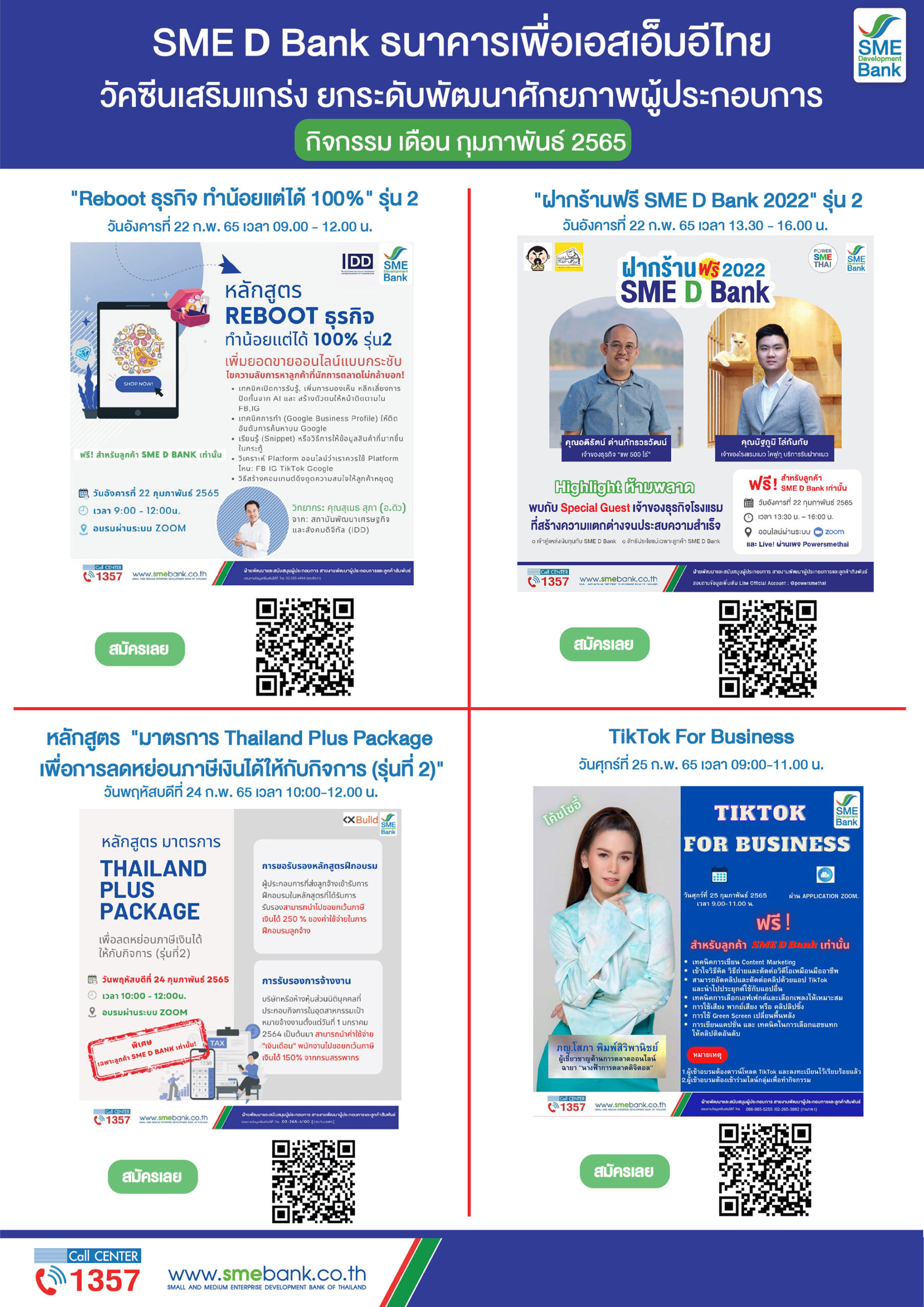 2.กิจกรรม “ฝากร้านฟรี SME D Bank 2022” รุ่นที่ 2 โดยวิทยากรพิเศษเจ้าของธุรกิจโรงแรมชื่อดัง มาถ่ายทอดเคล็ดลับทำตลาดออนไลน์จนประสบความสำเร็จ ได้แก่ คุณอติภัทร ด่านภัทรวรวัฒน์ เจ้าของธุรกิจ “แพ 500 ไร่” และคุณฐภูมิ โล่กันภัย เจ้าของโรงแรมแมว “โคฟูกุ” รวมถึง เปิดโอกาสให้ผู้ประกอบการเอสเอ็มอีทุกท่านที่เข้าร่วมกิจกรรม โปรโมทสินค้า ฟรี! ผ่านช่องทางของธนาคาร เช่น เพจ Powersmethai และเว็บไซต์ wdev.smebank.co.th เป็นต้น รวมถึง ได้รับความรู้เตรียมความพร้อมเข้าสู่แหล่งเงินทุน จัดในวันที่ 22 ก.พ. 2565 เวลา 13.30-16.00 น.