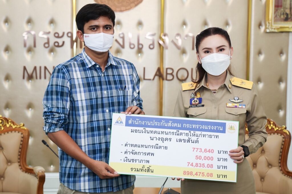 โดย ในวันนี้ กระทรวงแรงงาน โดยสำนักงานประกันสังคม ได้มอบสิทธิประโยชน์เงินทดแทนกรณีเสียชีวิตเนื่องจากการทำงานให้แก่นายจ้าง ทายาทและผู้มีสิทธิ มีสิทธิได้รับเงินทดแทนตามพระราชบัญญัติเงินทดแทน พ.ศ.2537 และเงินบำเหน็จชราภาพกองทุนประกันสังคม แก่ญาติจำนวน 3 ราย ได้แก่