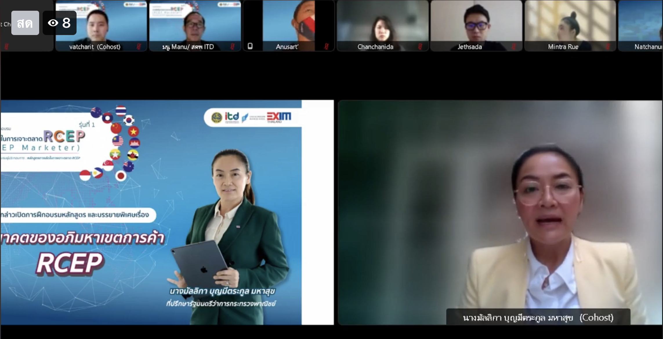 นางมัลลิกา บุญมีตระกูล มหาสุข ที่ปรึกษารัฐมนตรีว่าการกระทรวงพาณิชย์ เปิดการฝึกอบรมหลักสูตร “ทางลัดในการเจาะตลาด RCEP” (RCEP Marketer) รุ่นที่ 1 ในรูปแบบออนไลน์ผ่านระบบ Webex โดยระบุว่า การอบรมจะเป็นประโยชน์ในการผลักดันการส่งออกซึ่งเป็นนโยบายของรัฐบาลโดยความตกลง RCEP จะทำให้ผู้ประกอบการสามารถลดต้นทุน เพิ่มโอกาสและมีทางเลือกในการขยายการค้าและการใช้ต้นทุนวัตถุดิบได้มากขึ้น