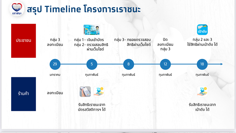 นายอาคม เติมพิทยาไพสิฐ รัฐมนตรีว่าการกระทรวงการคลัง กล่าวว่า การเปิดรับลงทะเบียนโครงการเราชนะ จะเปิดลงทะเบียนวันที่ 29 มกราคม 2564 แบ่งเป็น 3 กลุ่ม โดยกลุ่มแรกคือผู้ที่ถือบัตรสวัสดิการแห่งรัฐ ไม่ต้องลงทะเบียนเนื่องจากระบบจะให้เข้าร่วมโครงการโดยอัตโนมัติโดยได้รับเงินวันแรก 5 กุมภาพันธ์ 2564 ส่วนกลุ่มที่ 2 คือผู้มีแอปเป๋าตังและผู้ที่เคยลงทะเบียนใน โครงการคนละครึ่ง ระบบจะนำข้อมูลดำเนินการลงทะเบียนให้หากเข้าข่ายได้รับและกลุ่มที่ 3 สำหรับผู้ที่ลงทะเบียนผ่าน www.เราชนะ.com โดยในกลุ่ม 2-3 จะจ่ายเงินในวันแรก 18 กุมภาพันธ์ 2564