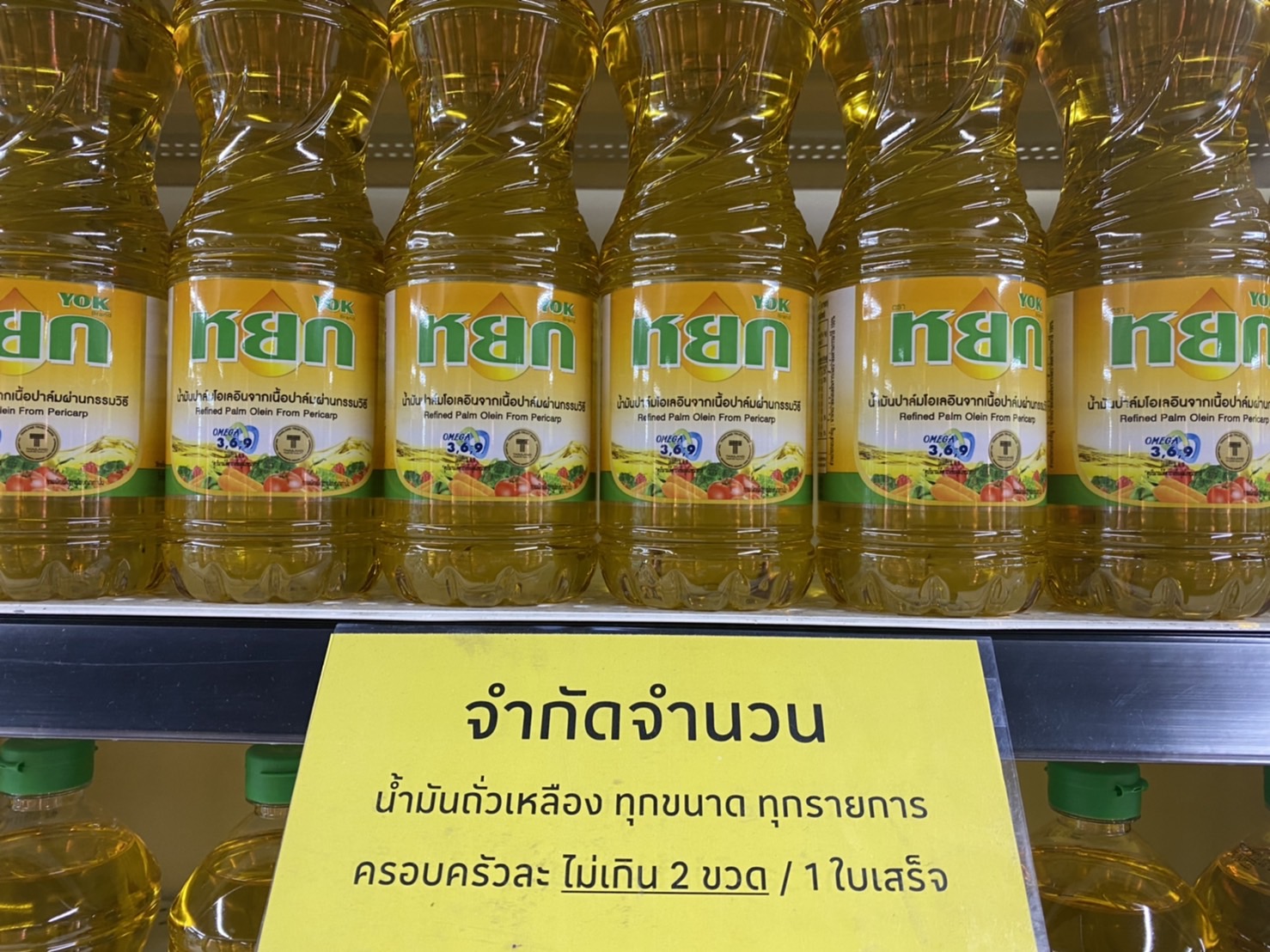 ส่วนราคาน้ำมันพืชปาล์ม อยู่ที่ราคาขวดละ 62 บาท โดยทางห้างสรรพสินค้าเทสโก้โลตัสได้จำกัดการซื้อน้ำมันพืชปาล์ม 1 ครอบครัวไม่เกิน 2-3 ขวด เพื่อเป็นการป้องกันการกักตุนสินค้าและกระจายสินค้าให้กับประชาชนได้อย่างทั่วถึง