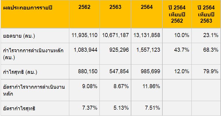 ด้านผลการดำเนินงานของ บจ. ในตลาดหลักทรัพย์ เอ็ม เอ ไอ (mai) ปี 2564 มียอดขายรวม 171,238 ล้านบาท เพิ่มขึ้น 13.3% กำไรจากการดำเนินงาน 10,757 ล้านบาท เพิ่มขึ้น 38.9% และกำไรสุทธิ 8,438 ล้านบาท เพิ่มขึ้น 273.6%