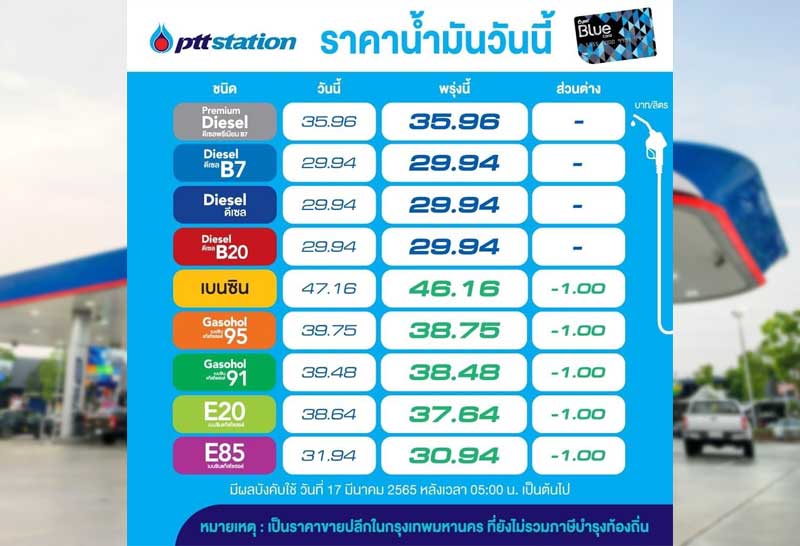 บมจ.ปตท.น้ำมันและการค้าปลีก (OR) และ บมจ.บางจาก คอร์ปอเรชั่น (BCP) ประกาศปรับลดราคาขายปลีกน้ำมันกลุ่มเบนซินและแก๊สโซฮอล์ทุกชนิด 1 บาทต่อลิตร ส่วนกลุ่มดีเซลทุกชนิด คงเดิม มีผลพรุ่งนี้ 17 มี.ค.2565 ตั้งแต่เวลา 05.00 น. เป็นต้นไป