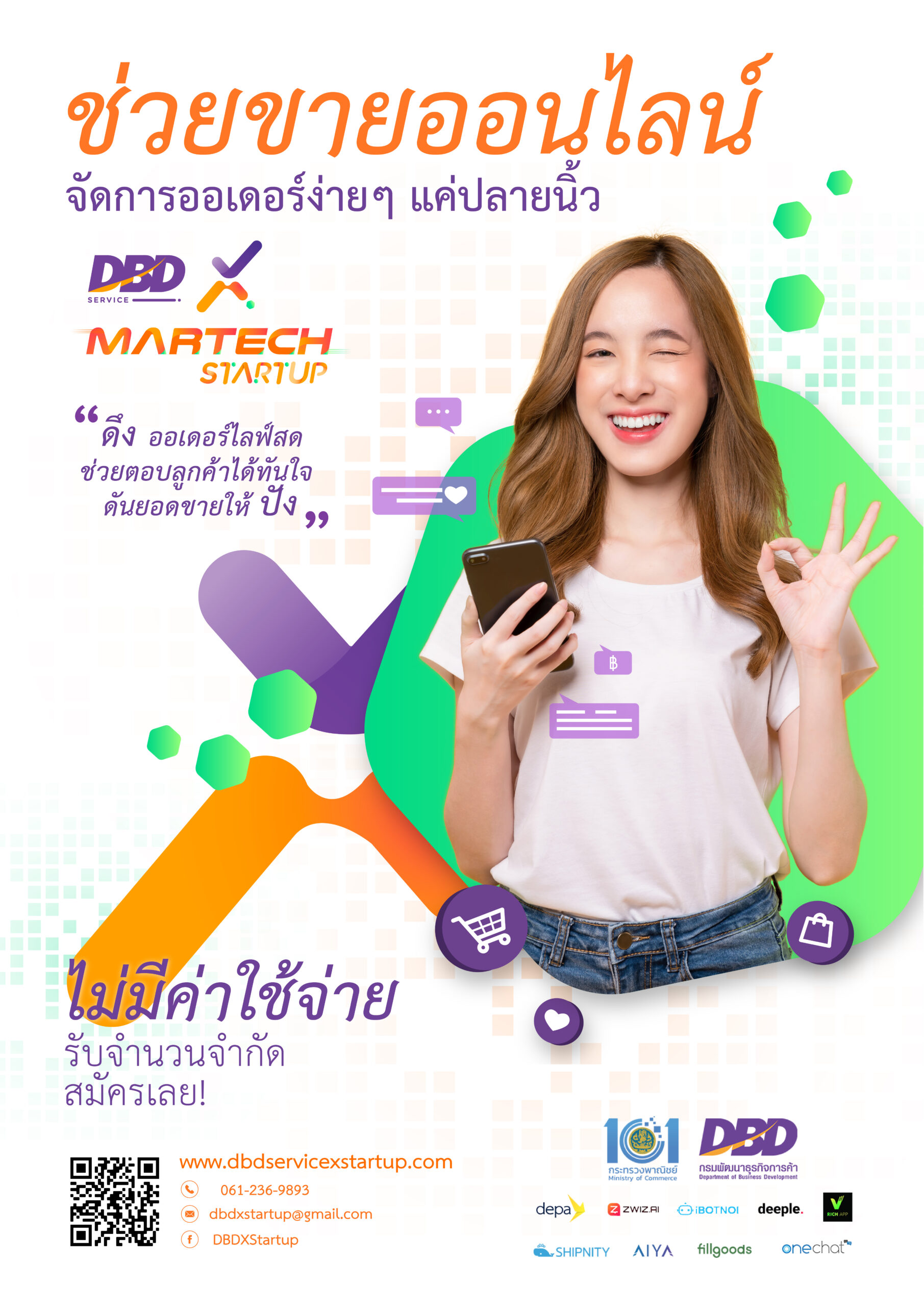 จึงได้จัดทำโครงการ DBD SERVICE X MARTECH STARTUP เป็นโครงการที่จะช่วยตอบโจทย์ และแก้ไขปัญหาต่างๆ ที่ธุรกิจออนไลน์ต้องประสบ โดยเปิดโอกาสให้ร้านค้าออนไลน์ที่ผ่านการคัดเลือกได้ทดลองใช้เครื่องมือส่งเสริมการตลาดออนไลน์ที่หลากหลาย ใช้ง่าย เห็นผลชัดเจนและแม่นยำ จาก 8 สตาร์ทอัพชั้นนำ ประกอบด้วย Zwiz.ai, iBOTNOI, deeple., V Rich App, Shipnity, AIYA, Fillgoods, และ Onechat.ai เป็นระยะเวลา 3 เดือน โดยไม่มีค่าใช้จ่าย เพื่อให้ผู้ประกอบการเอสเอ็มอีสามารถรักษาฐานลูกค้าและเข้าถึงลูกค้าใหม่ๆ ได้ด้วยระบบ AI Chatbot แบบครบวงจร ที่สามารถให้ข้อมูลสินค้า รับออเดอร์ สรุปยอดอัตโนมัติ ผ่าน แชต คอมเมนต์ และ Live สด บน Online Platform ต่างๆ ทำให้สามารถจัดการระบบหลังร้าน ปิดการขายได้โดยไม่ต้องใช้พนักงานจำนวนมาก ช่วยทำงานแทนแอดมิน ตอบคำถามลูกค้าได้ตลอด 24 ชั่วโมง อีกทั้ง มีการสรุปข้อมูลการขายเพื่อวิเคราะห์ต่อยอดข้อมูลดังกล่าว นำไปสู่การปิดจุดอ่อนและเสริมจุดแข็งของร้านค้า