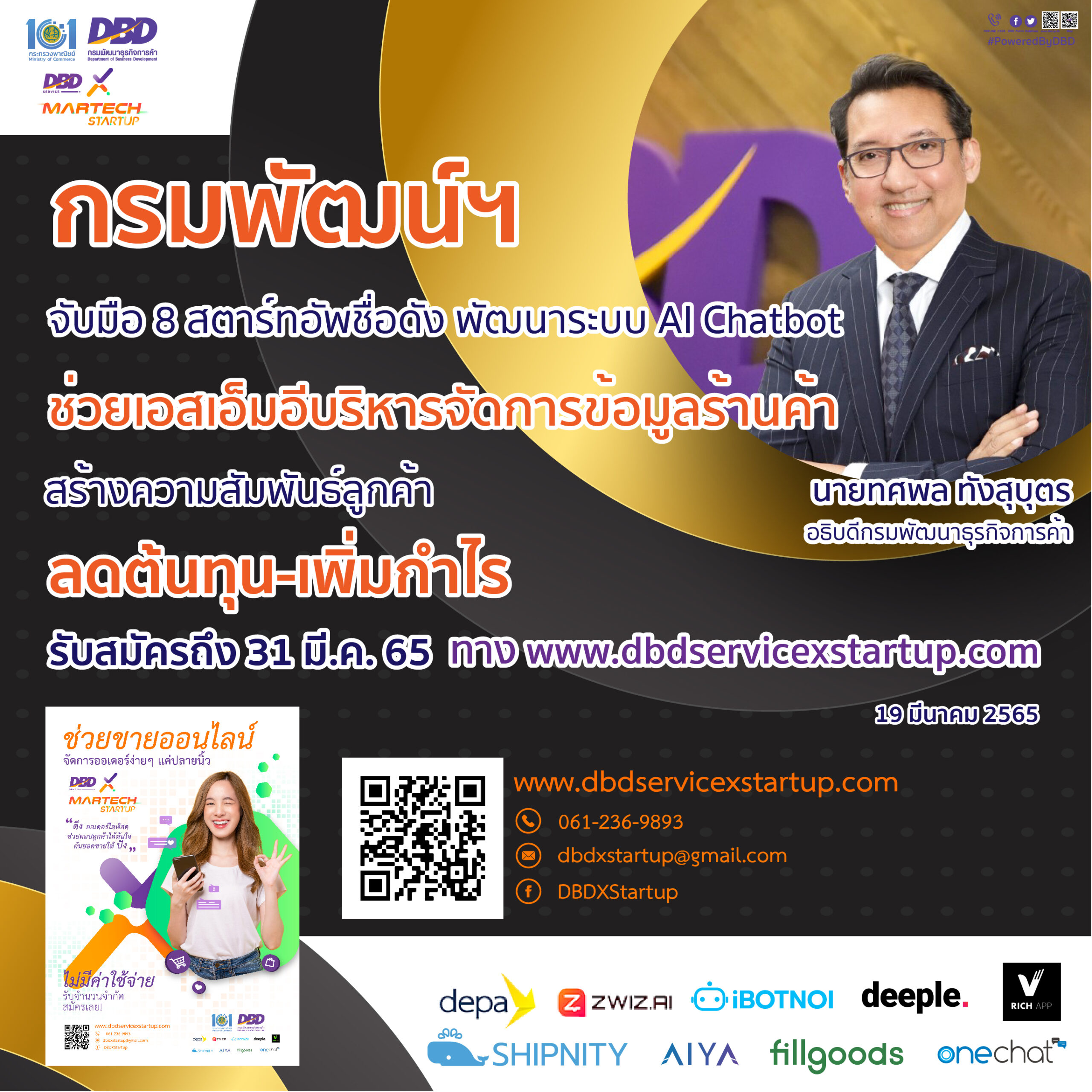 จึงได้จัดทำโครงการ DBD SERVICE X MARTECH STARTUP เป็นโครงการที่จะช่วยตอบโจทย์ และแก้ไขปัญหาต่างๆ ที่ธุรกิจออนไลน์ต้องประสบ โดยเปิดโอกาสให้ร้านค้าออนไลน์ที่ผ่านการคัดเลือกได้ทดลองใช้เครื่องมือส่งเสริมการตลาดออนไลน์ที่หลากหลาย ใช้ง่าย เห็นผลชัดเจนและแม่นยำ จาก 8 สตาร์ทอัพชั้นนำ ประกอบด้วย Zwiz.ai, iBOTNOI, deeple., V Rich App, Shipnity, AIYA, Fillgoods, และ Onechat.ai เป็นระยะเวลา 3 เดือน โดยไม่มีค่าใช้จ่าย เพื่อให้ผู้ประกอบการเอสเอ็มอีสามารถรักษาฐานลูกค้าและเข้าถึงลูกค้าใหม่ๆ ได้ด้วยระบบ AI Chatbot แบบครบวงจร ที่สามารถให้ข้อมูลสินค้า รับออเดอร์ สรุปยอดอัตโนมัติ ผ่าน แชต คอมเมนต์ และ Live สด บน Online Platform ต่างๆ ทำให้สามารถจัดการระบบหลังร้าน ปิดการขายได้โดยไม่ต้องใช้พนักงานจำนวนมาก ช่วยทำงานแทนแอดมิน ตอบคำถามลูกค้าได้ตลอด 24 ชั่วโมง อีกทั้ง มีการสรุปข้อมูลการขายเพื่อวิเคราะห์ต่อยอดข้อมูลดังกล่าว นำไปสู่การปิดจุดอ่อนและเสริมจุดแข็งของร้านค้า